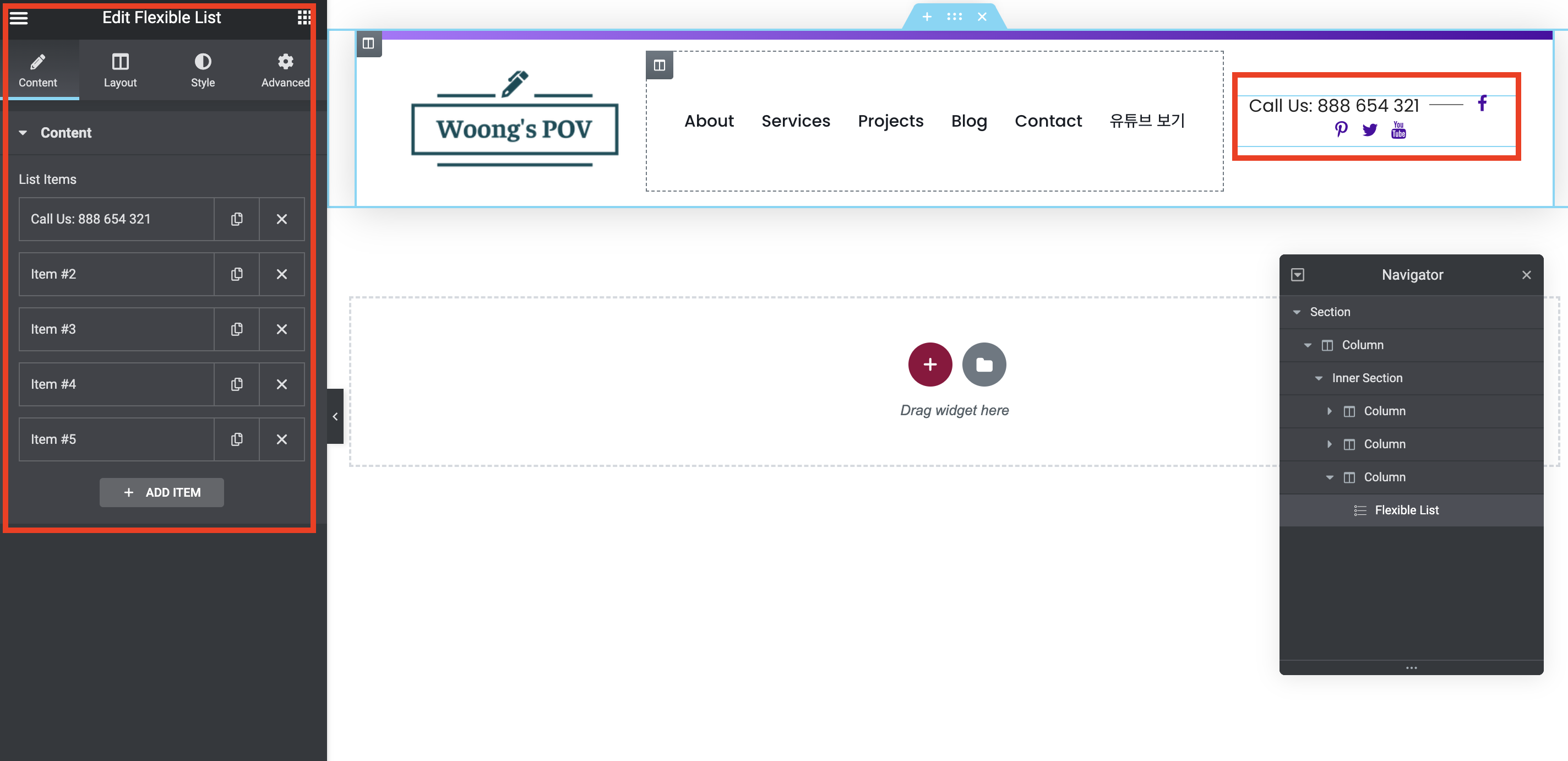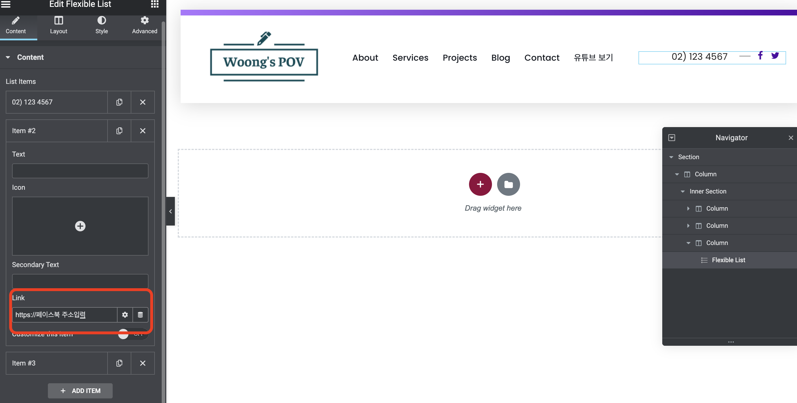 위와 같은 화면이 보이게 될 텐데, 우 상단에 빨간색 박스로 표시해둔 연락처 부분을 클릭하면 좌측의 수정 화면에 Content가 뜨면서 연락처와 함께 삽입되어 있는 4개의 SNS 버튼 항목을 확인할 수 있다. List items라고 표시된 부분의 항목을 하나하나 선택해서 수정을 진행하면 된다. 만약 필요한 항목이 없다면 각 항목별로 우측에 있는 x박스를 선택해서 삭제해 주면 된다. 연락처는 임의의 번호로 바꿔보고, 페이스북과, 트위터가 아닌 두 번째, 네 번째 items는 삭제해보기로 한다.
