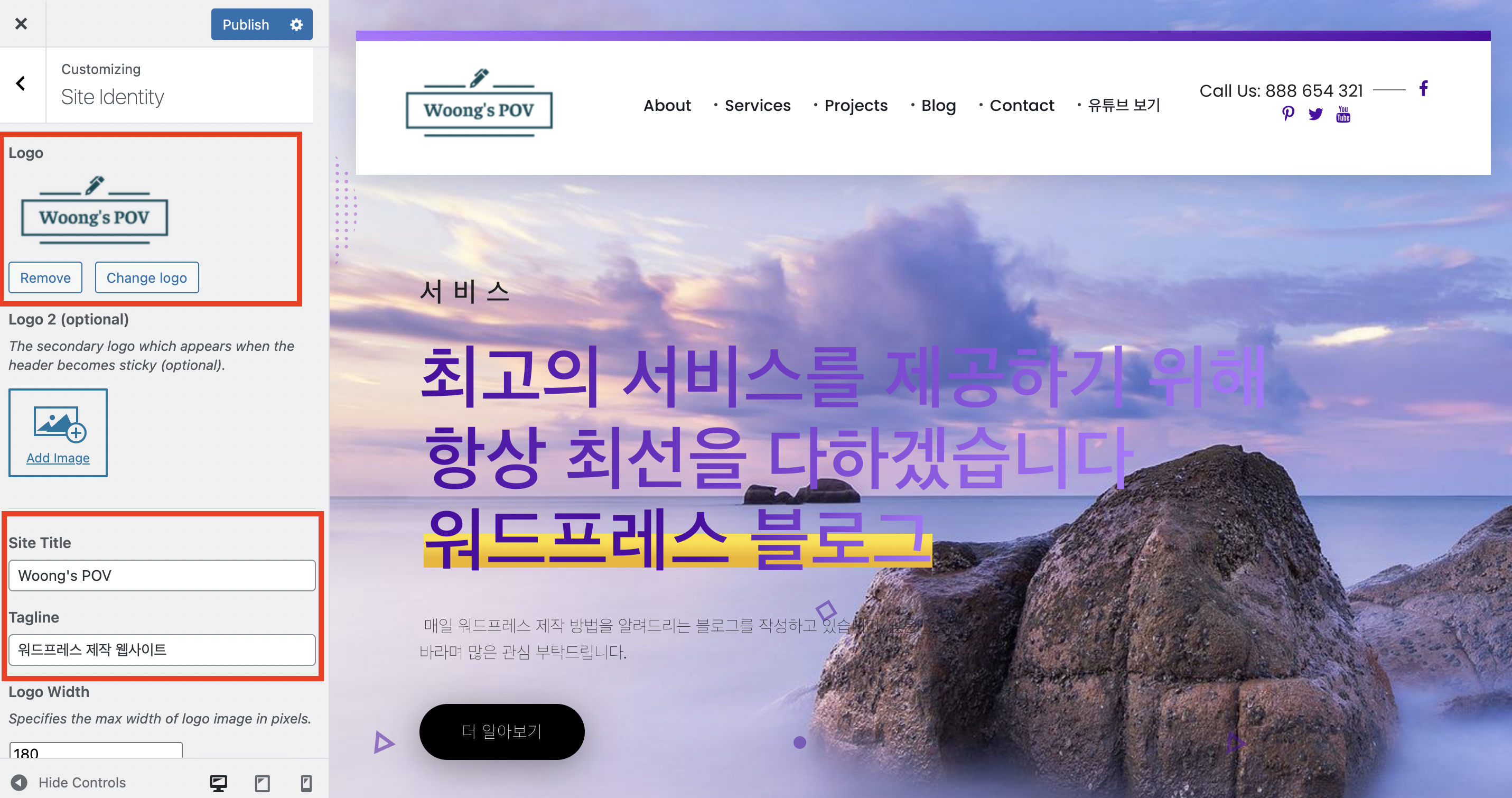 Site Title 항목에는 이 사이트의 이름과 간단한 설명을 적어준다. 여기 들어가는 Site Title과 Tagline은 앞으로 링크 공유를 하거나, 혹은 검색 엔진에 검색했을 때 보일 내 사이트의 이름과 설명이므로, 정확하게 입력해 주도록 한다. 작업 후에 좌측 상단의 Publish 버튼을 꼭 눌러주자, 그럼 로고가 변경돼 있음을 확인할 수 있다.