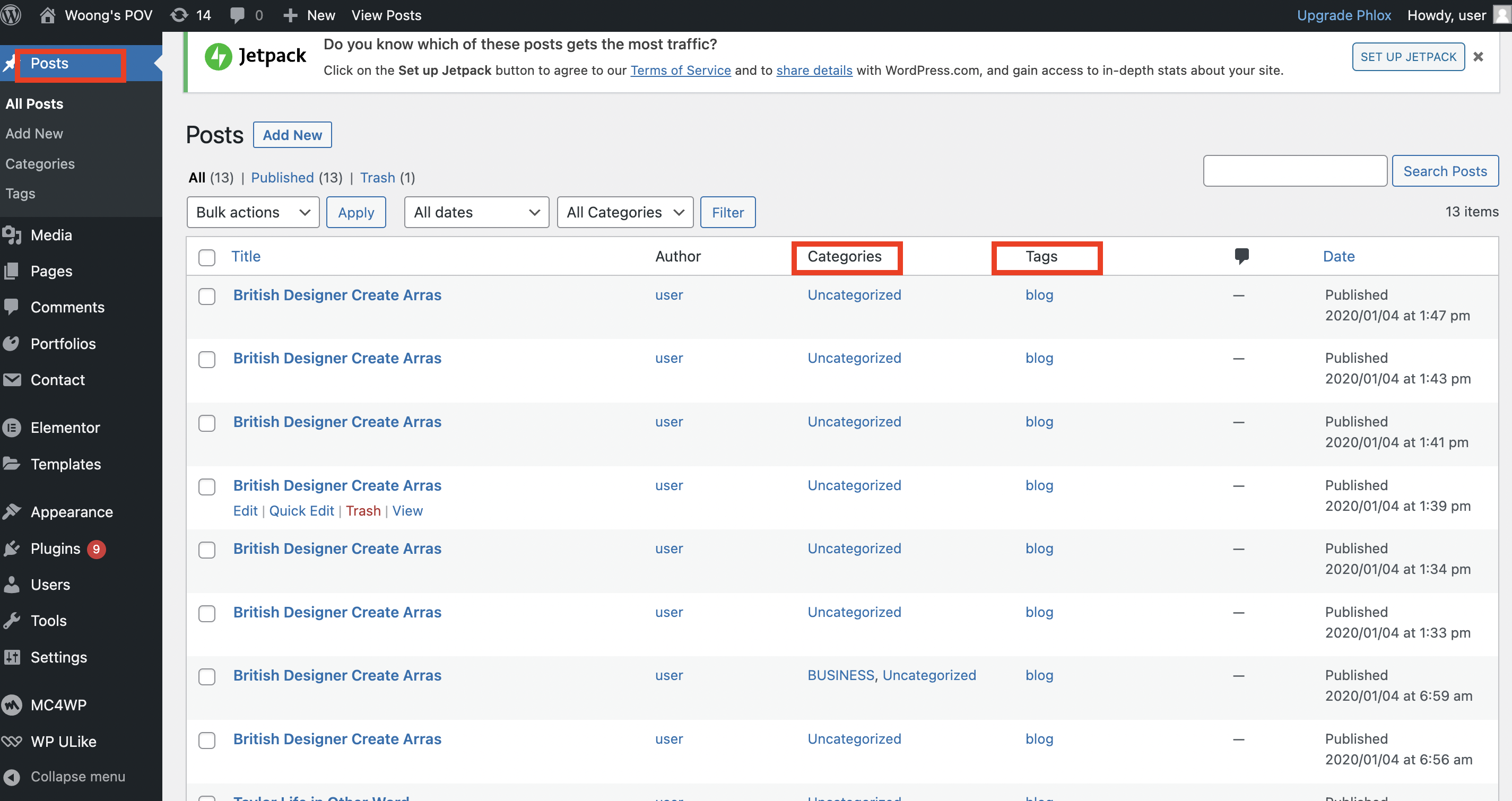 말 그대로 앞으로 작성하게 될 글의 카테고리이다. 필자는 워드프레스에 관한 포스팅을 할 생각으로 워드프레스 카테고리를 만들어 보았다. 앞으로 워드프레스에 관한 글을 작성하게 되면 글을 쓰고 이 카테고리를 선택하여 글을 게시하면 된다. 이제 글을 작성하는 방법에 대해서 알아보자. 지금 posts에 보이는 글 들은 처음에 데모를 받을 때 따라서 받아진 데모 콘텐츠들이다. 여기 보이는 글 들은 블로그 페이지에 들어가면 보이는 글 들이라고 생각하면 된다. 데모로 들어가 있는 실제로 필자가 제작하는 사이트와는 관계가 없는 콘텐츠들이기 때문에 우선 노출이 되지 않도록 글들을 draft로 처리하여 가려주고, 글 작성에 대해서 알아보겠다.