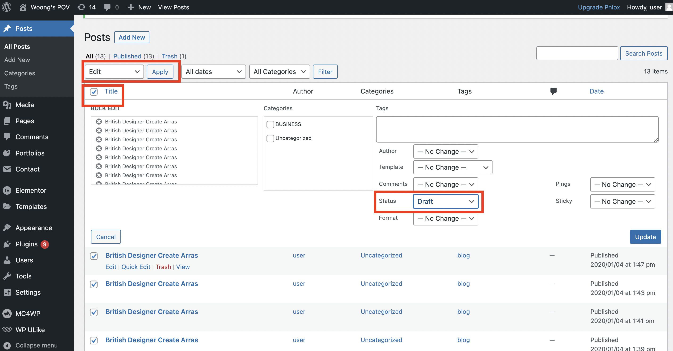 우선 위에 언급한 것처럼 데모 설치 시 들어온 불필요한 글들을 보이지 않도록 처리해주자. Title 옆에 체크박스를 체크하고, 위에 edit을 선택 후, Apply를 눌러준다. 그러면 우측에 status라는 항목이 생기는데 여기서 Draft를 선택하여 업데이트 버튼을 눌러준다. 굳이 삭제하지 않는 이유는, 혹여나 나중에 글의 레이아웃이 괜찮다면 복사를 해서 동일하게 사용할 수 있기 때문에 불필요하게 글의 수가 많지 않다면 그냥 draft처리를 해두곤 한다. 이건 제작자가 원하는 대로 하면 되니, 굳이 나중에 필요할 것 같지 않다면 전체 삭제를 해도 무방하다.