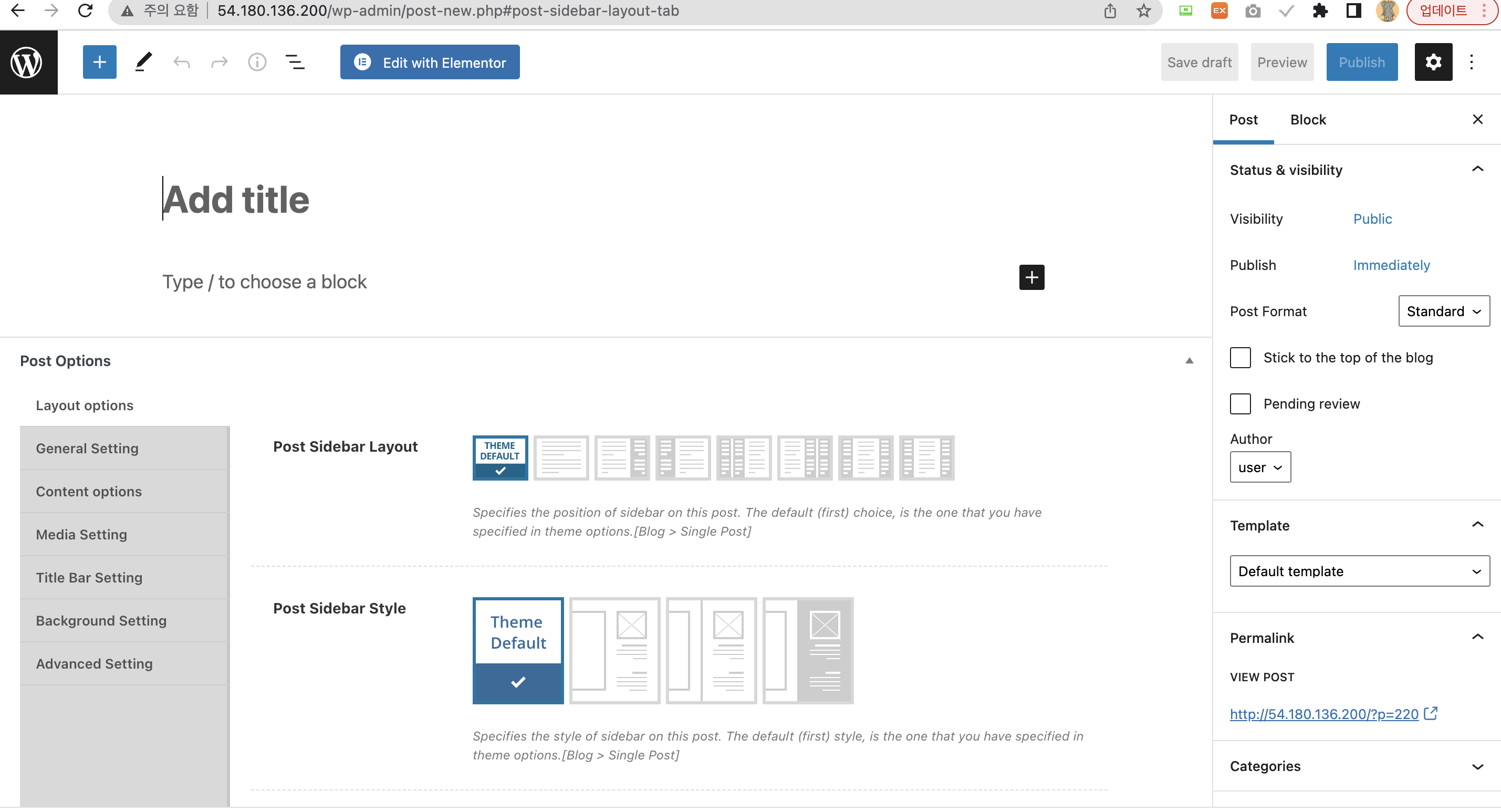 Posts > add new 버튼을 클릭하면 위와 같이 워드프레스 기본 글 작성 에디터가 보이게 된다. 여기서는 각각의 항목에 따라서 원하는 글을 작성해주면 된다. 제목 부분에는 제목을, 하단 내용 부분에는 내용을, 그리고 Post options 항목에서는 추가적으로 세팅하고 싶은 내용들을 하나하나 선택해보고 세팅하면서 작업을 진행하면 된다. 글을 쓰면서 최종적으로 완료되지 않은 경우에는 꼭 Publish 버튼을 누르지 말고, Save draft 버튼을 눌러서 저장해준다. Publish는 최대한 완료된 시점에 눌러주는 것으로 생각하면 된다.