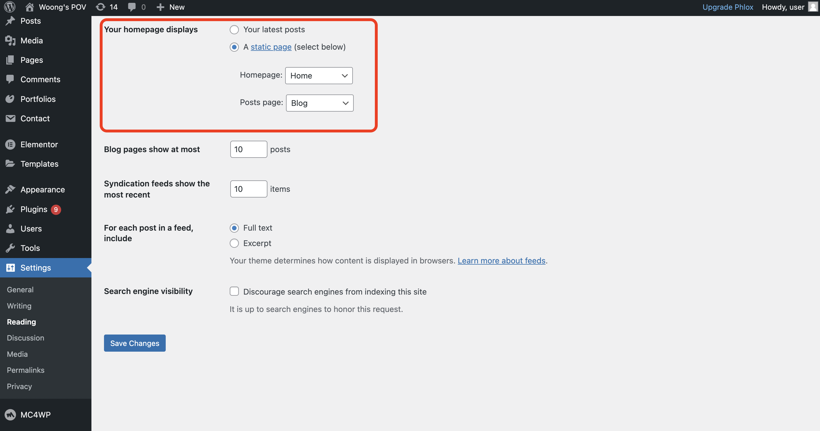 Setting > Reading 메뉴로 진입한다. 가장 상단에 보이는 Your homepage displays를 보면, Your latest posts 항목과 A static page라는 항목이 있다. 이는 제작하는 사이트를 블로그를 주로 하는 사이트로 할지, 혹은 웹사이트 형태로 고정 페이지가 항상 보이게끔 선택할지 하는 용도이다. 설명이 조금 이해가 어려운 듯하여, 조금 더 부가 설명을 해보겠다.