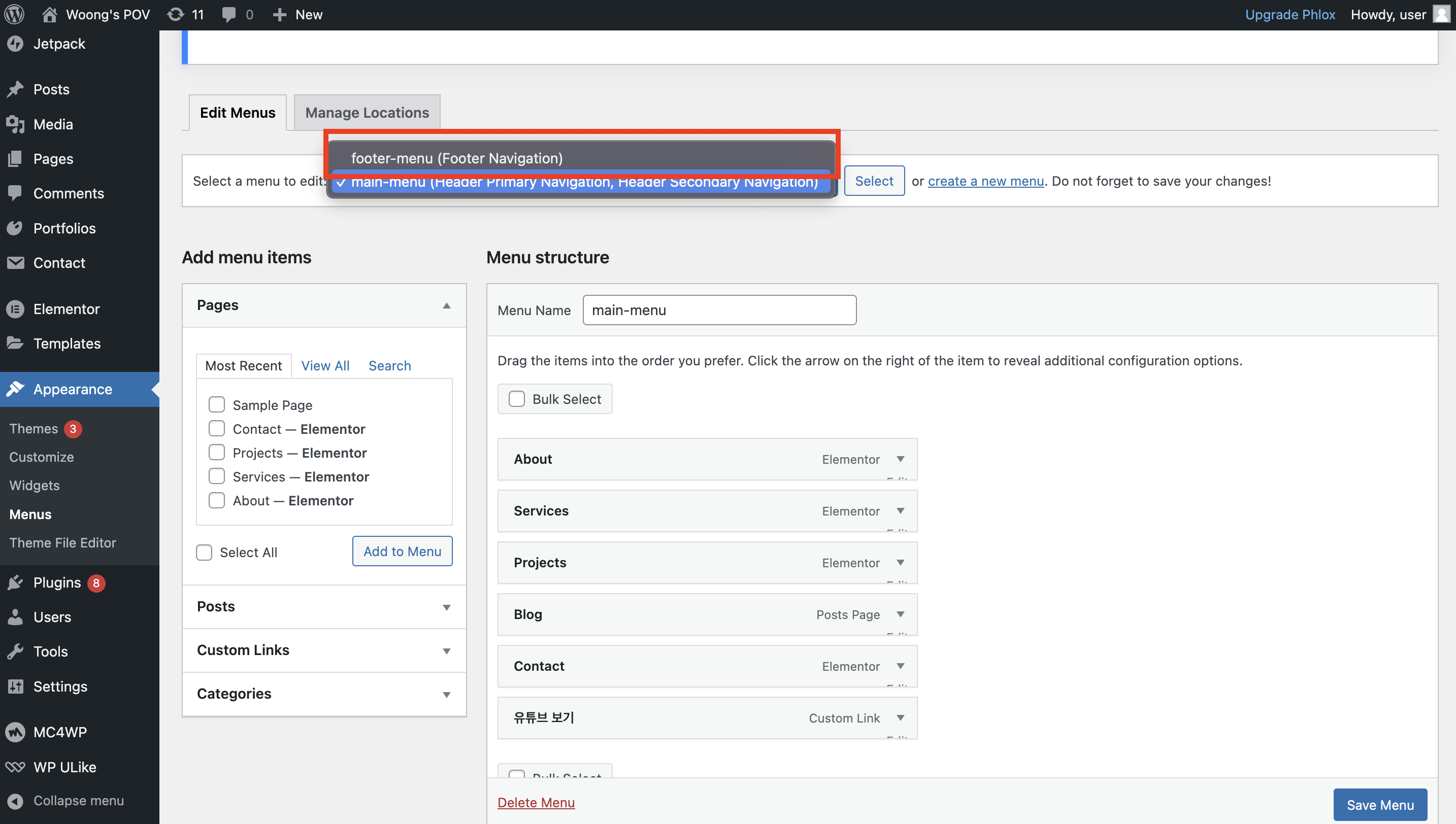메뉴의 보이는 텍스트는 각 메뉴 항목의 Navigation label 항목에서 수정해주면 된다. 필요한 내용과 메뉴 구성을 수정했다면, 우측 하단에 있는 save menu를 클릭해주면 적용된다. 이제 나머지 항목들도 필요한 내용들을 한국어로 변경하여 수정해주자.