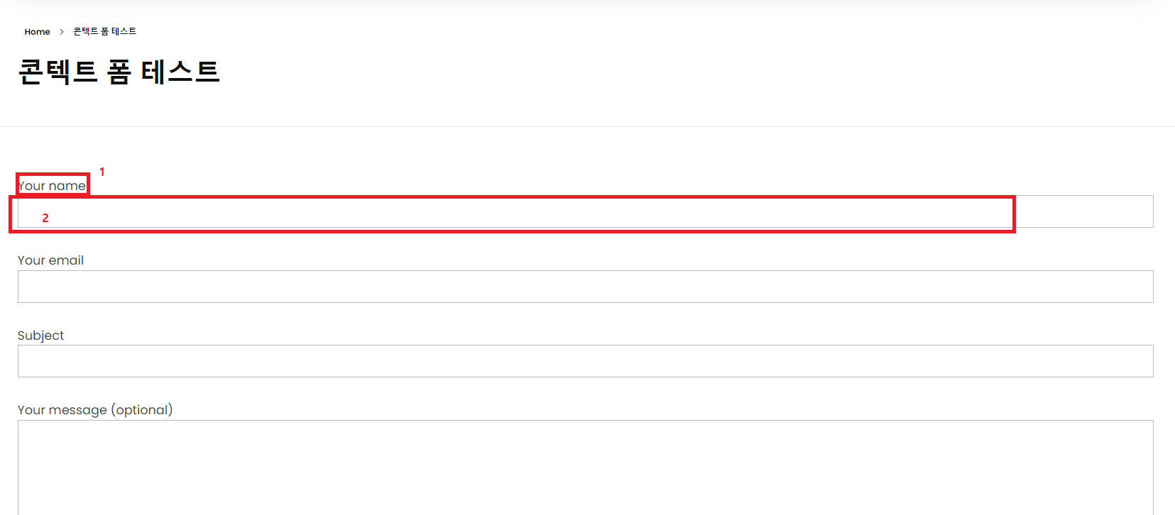 <label> 안에 있는 Your name 텍스트는 위에 보이는 양식에서 1번으로 표시된 어떤 내용을 입력하는지에 대한 설명으로 보면 되고, 그 뒤로 입력되어 있는 텍스트인 [text* your-name]는 2번으로 표기된 이름을 입력하는 공간이라고 생각하면 된다. 그 밑에 있는 Your email, subject, Your message 또한 유사한 구조로 생각하면 된다. 다만 여기서 한 가지 중요한 점은 [] 괄호 부분이 실제로 양식 안에서 해당 정보를 입력할 수 있도록 공간을 만들어 주는 명령어인데, 위의 코드 부분에서 확인해보면 약간의 차이들이 있다. 함께 살펴보도록 하자