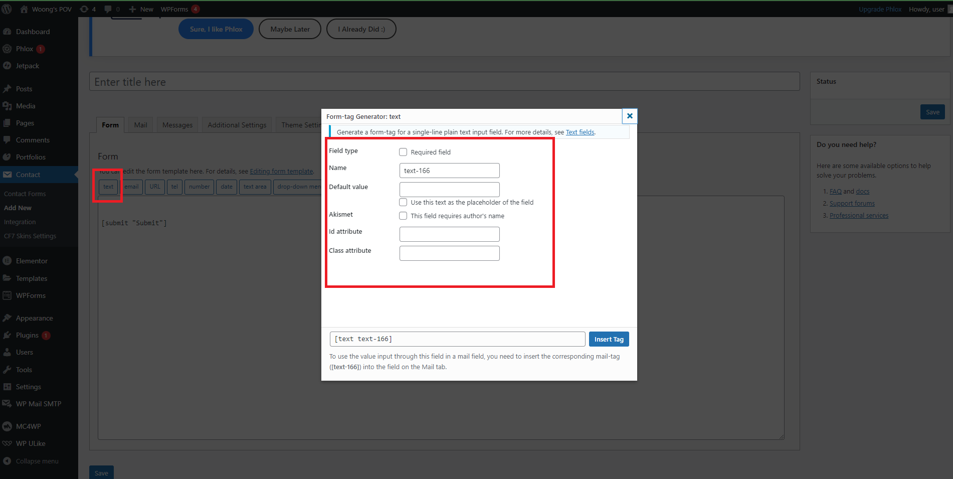 그럼 이제 직접 원하는 내용을 입력하여 양식을 만들어보자. 우선 text 버튼을 클릭하여 텍스트 항목을 양식에 넣어보자. text 버튼을 클릭하게 되면 위와 같은 창이 뜰 텐데, 여기서 각 항목을 하나하나 잘 설정해주면 바로 아래 보이는 insert tag 버튼을 눌러서 태그를 넣을 수 있다.