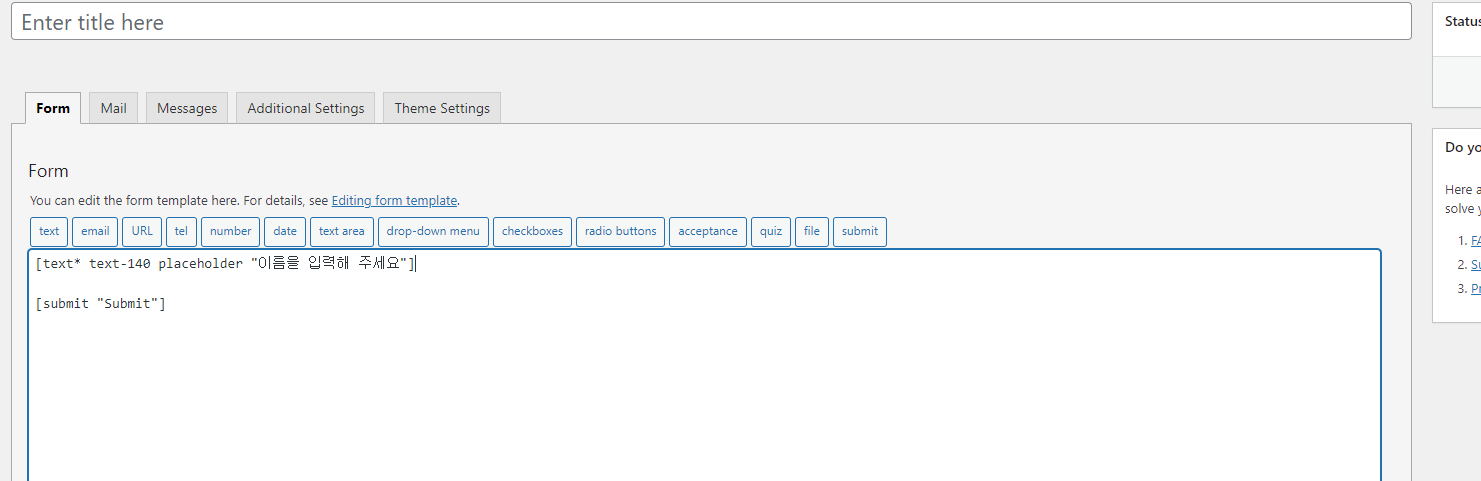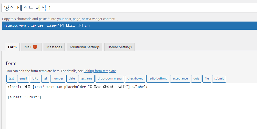 (참고:필자는 우선 기본적으로 뜨던 양식 안의 텍스트를 모두 지웠다. 최하단에 있는 [submit "submit"] 버튼만 사용해야 하기에 남겨두었으며, 모든 작업을 처음부터 보여주고자 한다)