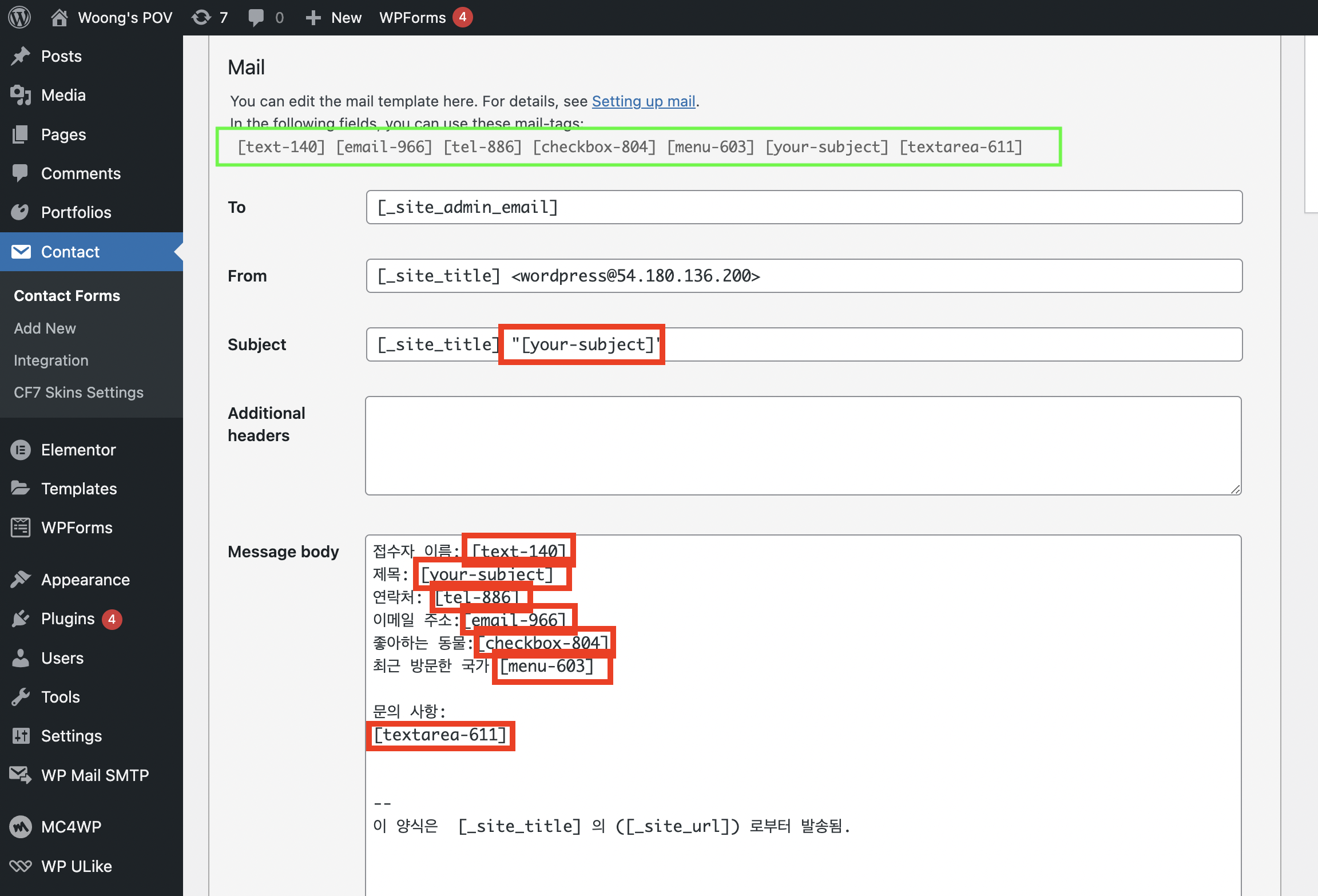 필자는 위와 같이 form에 있던 태그를 mail 탭에서 적용해 주었다. 각 태그별로 메일로 받았을 때 어떤 항목인지 이해하기 쉽도록 접수자 이름, 제목, 연락처, 이메일 주소 등 설명을 넣었다. 만약 설명이 없이 태그만 넣는다면 양식이 제출될 때 입력된 내용만 딱 보여서 어떤 항목인지 헷갈릴 수 있으니 설명을 넣어주는 편이 좋다.