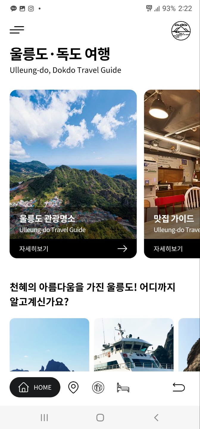 '울릉도 여행' 앱에서는 울릉도에서 여행을 할만한 곳들에 대한 사진과 정보를 확인할 수 있다. 맛집이나 숙소에 대한 정보들도 확인이 가능하다.