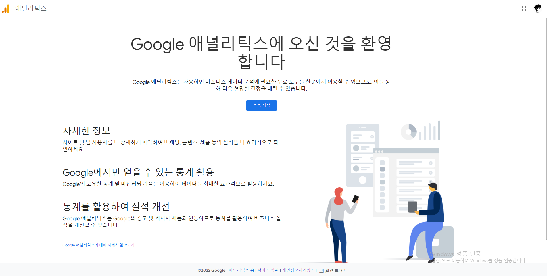 먼저 구글 애널리틱스 사이트에 들어가서 중간에 보이는 측정 시작 버튼을 눌러줍니다.