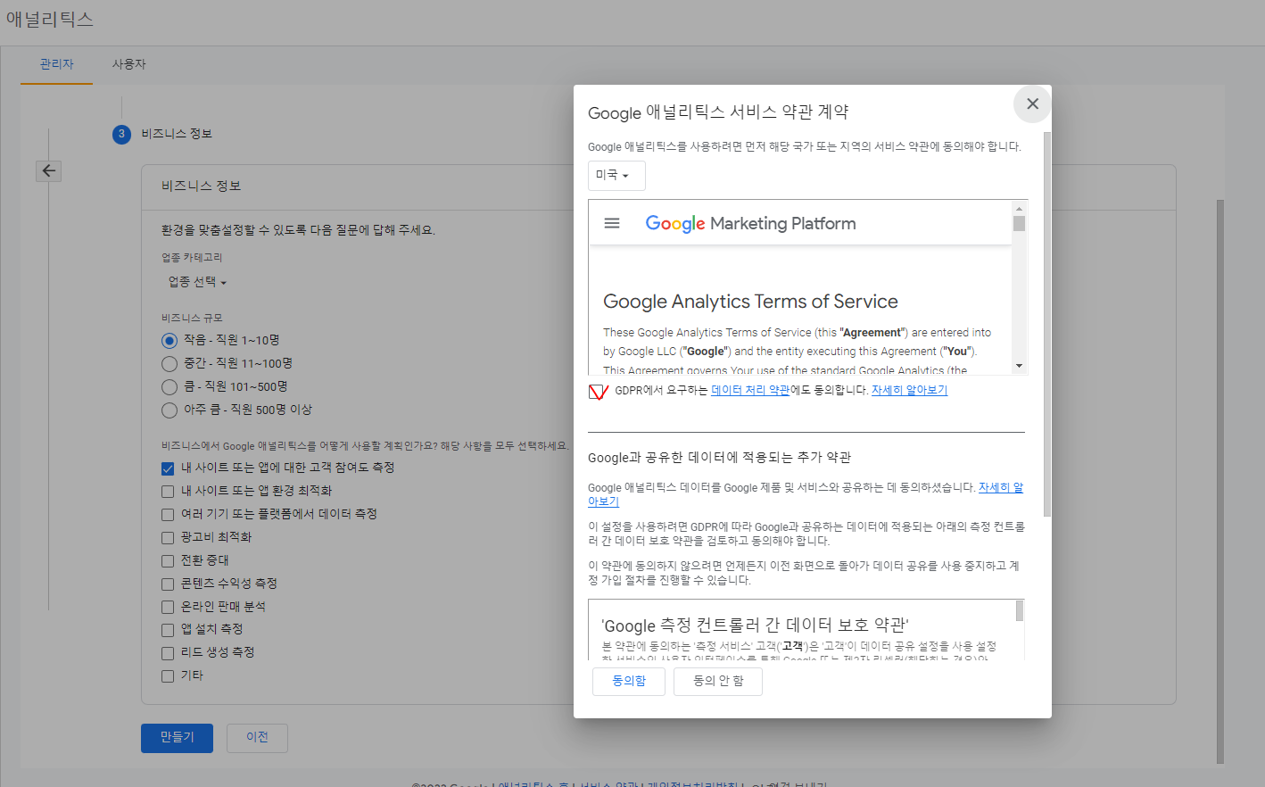 운영하시는 비즈니스의 규모에 맞게 선택해주시고, 구글 애널리틱스 사용 목적을 선택해주시면 됩니다. 크게 중요한 부분은 아니므로 적당히 선택하고 만들기 버튼을 눌러주면 됩니다.