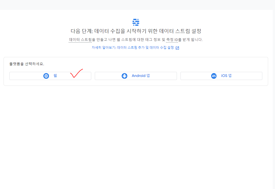 이제 어디에 구글 애널리틱스를 사용할지 선택하는 항목이 나오는데, 워드프레스 사이트에 사용할 계획이므로, 웹을 선택해 줍니다.