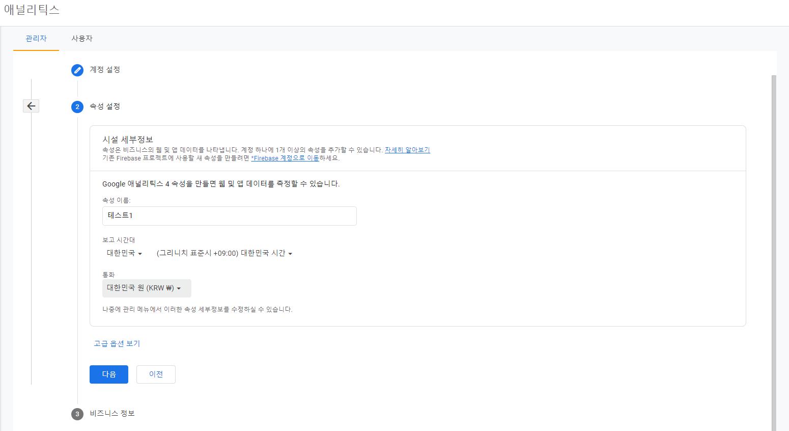 속성은 위에 설정한 개정안에서 포함되는 하위 개념으로, 구글 애널리틱스를 향 후 고도화하여 특정한 속성별로 나누어 보고자 할 때 편리합니다. 이번 포스트에서는 우선 그 부분은 다루지 않고, 하나의 속성을 만들어주고 넘어갑니다.