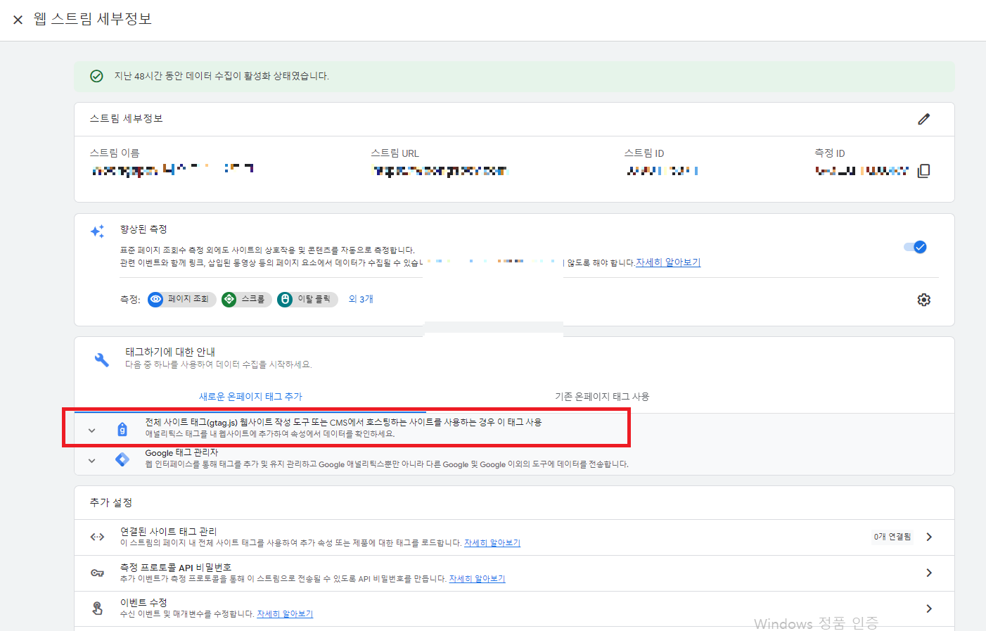 이제 스트림이 만들어졌고, 하단 부분에 '전체 사이트 태그'와 관련된 항목이 있습니다. 클릭해 주세요.