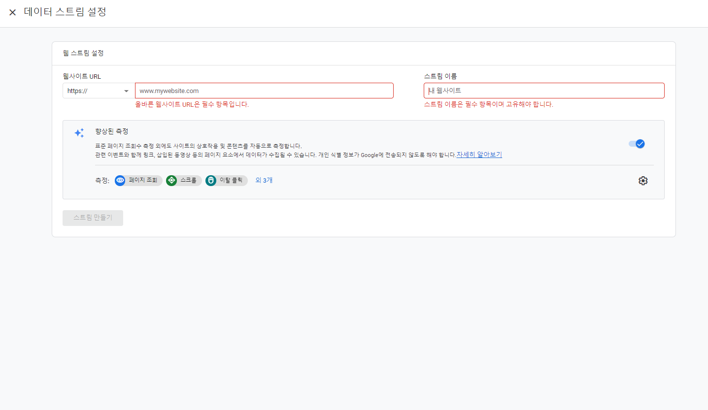 워드프레스를 어떤 도메인의 사이트와 연결할지 설정하는 곳입니다. 가지고 계신 워드프레스 사이트의 도메인을 입력해주세요. 스트림 이름은 사이트 이름으로 써주시는 게 좋습니다.