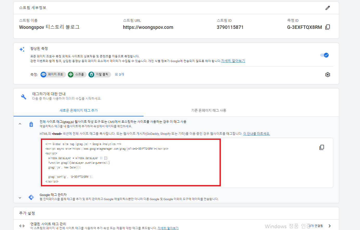 이제 스트림이 만들어졌고, 하단 부분에 '전체 사이트 태그'와 관련된 항목이 있습니다. 클릭해 주세요.