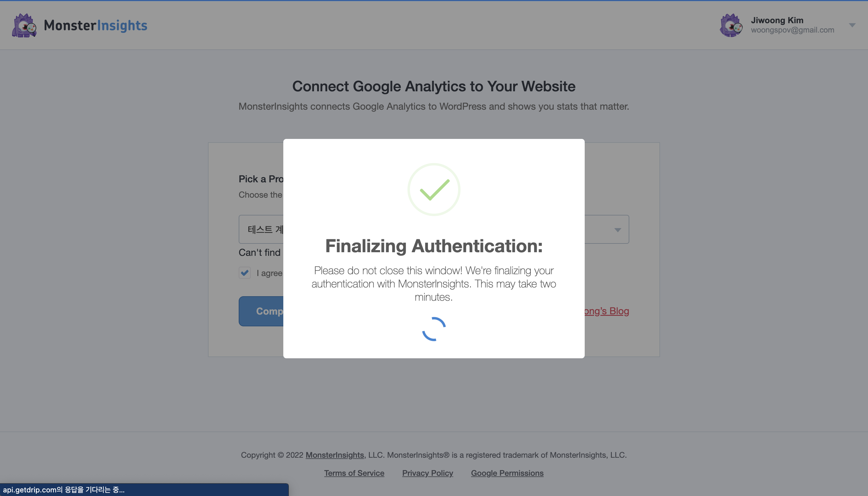 위와 같이 monsterInsights 플러그인과 제가 미리 만들어 두었던 구글 애널리틱스 계정과 간단히 연결 작업이 마무리됩니다.