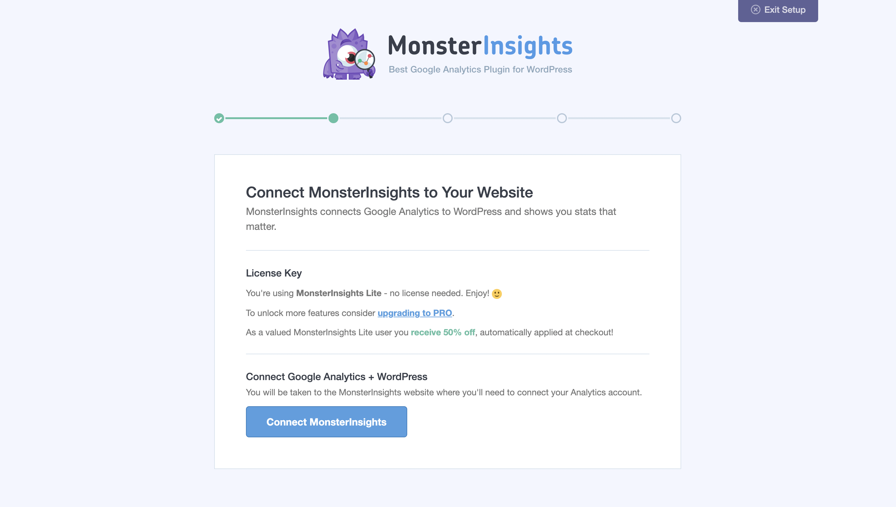 Plugin > Add New 버튼을 클릭하여 MonsterInsight를 검색 후, 설치해주세요. 설치 후에는 활성화를 하시면 바로 아래 화면과 같이 MonsterInsight의 세팅 마법사 화면으로 이동하게 됩니다.