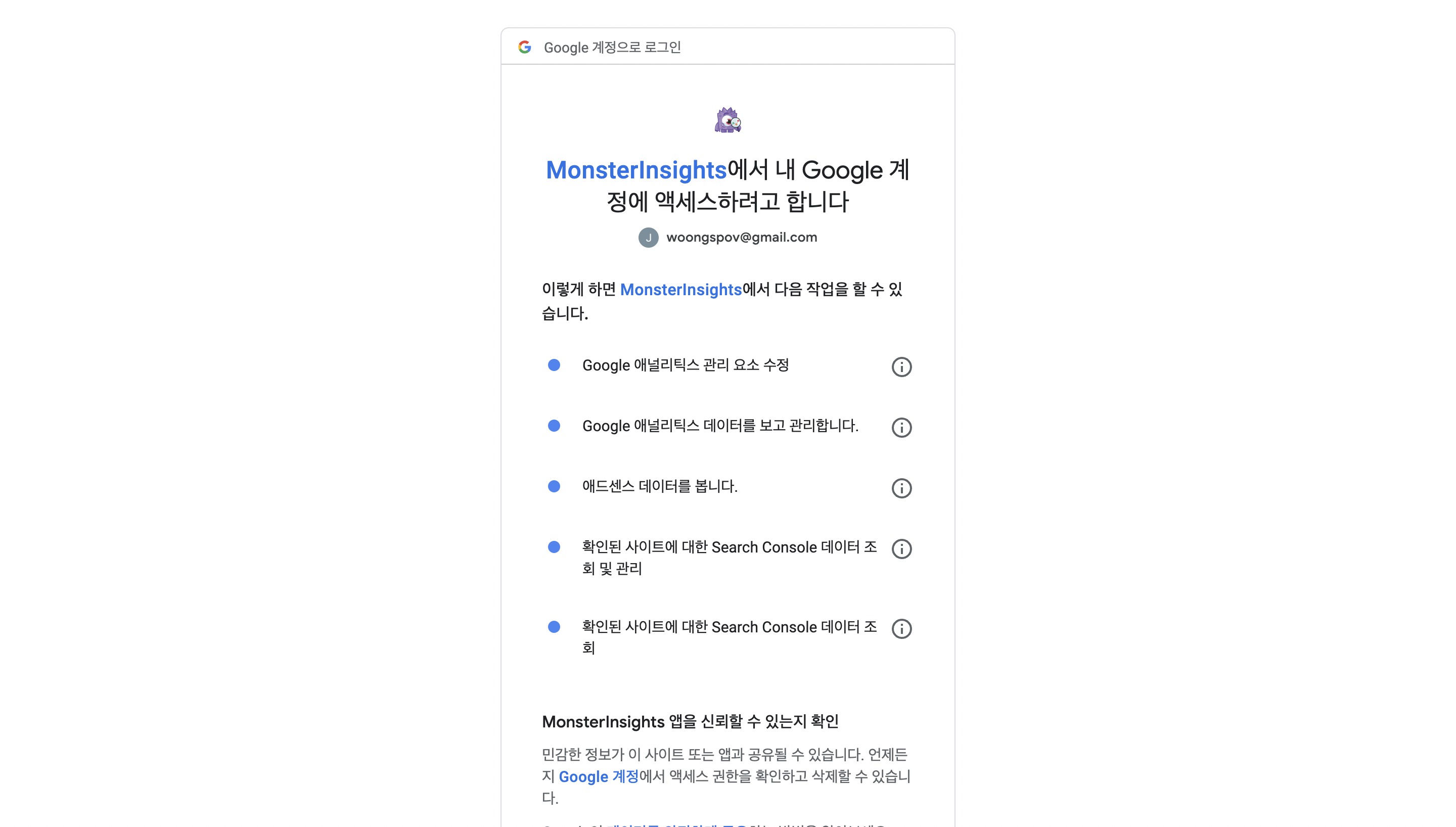 monsterInsights에서 내 구글 계정의 위와 같은 데이터를 확인할 수 있도록 하는 것에 동의하고 다음 페이지로 넘어갑니다.