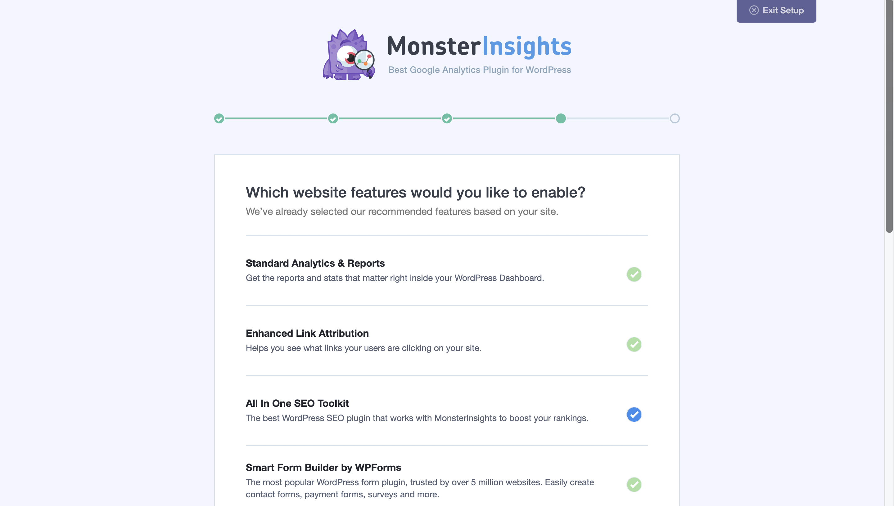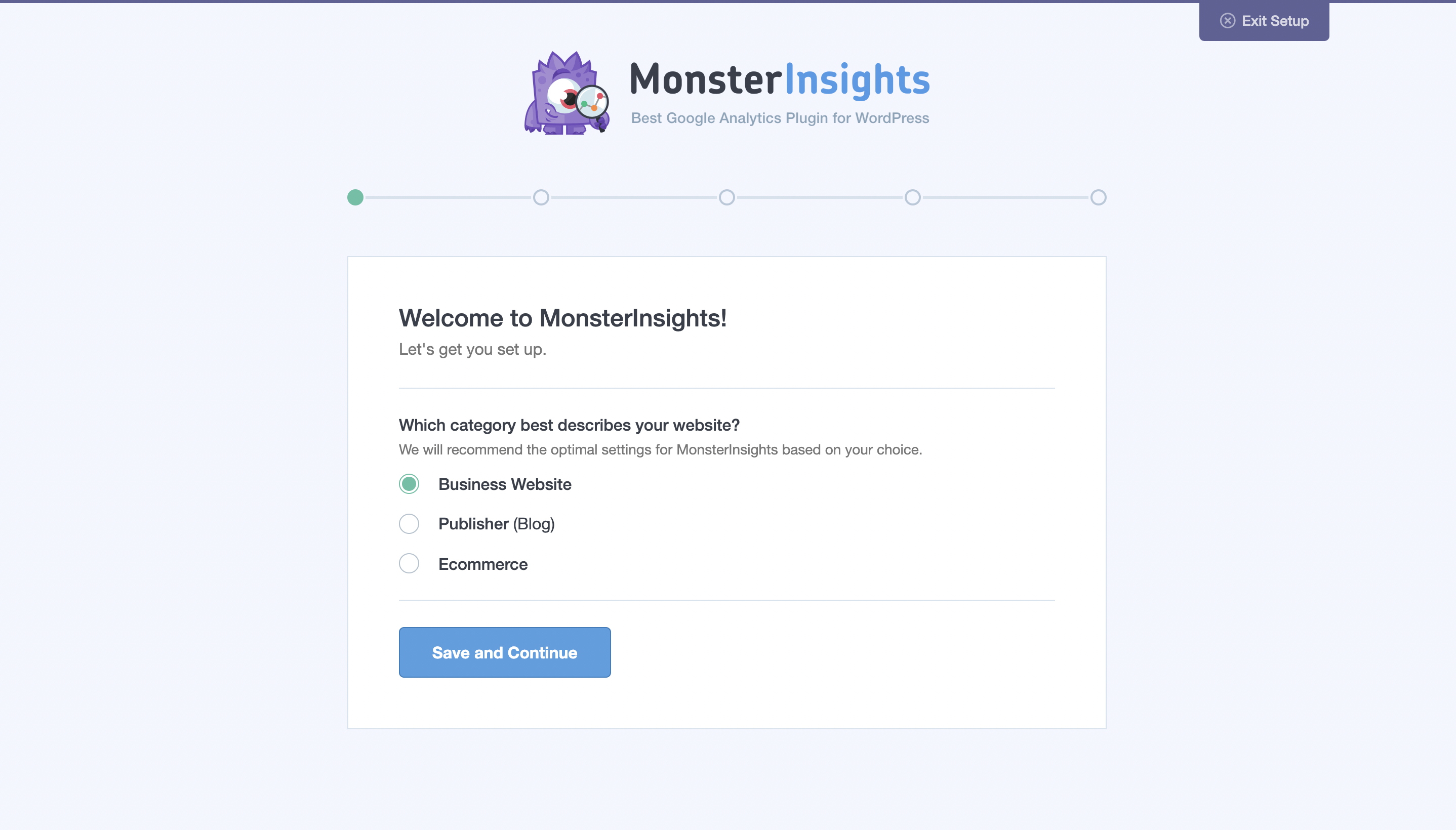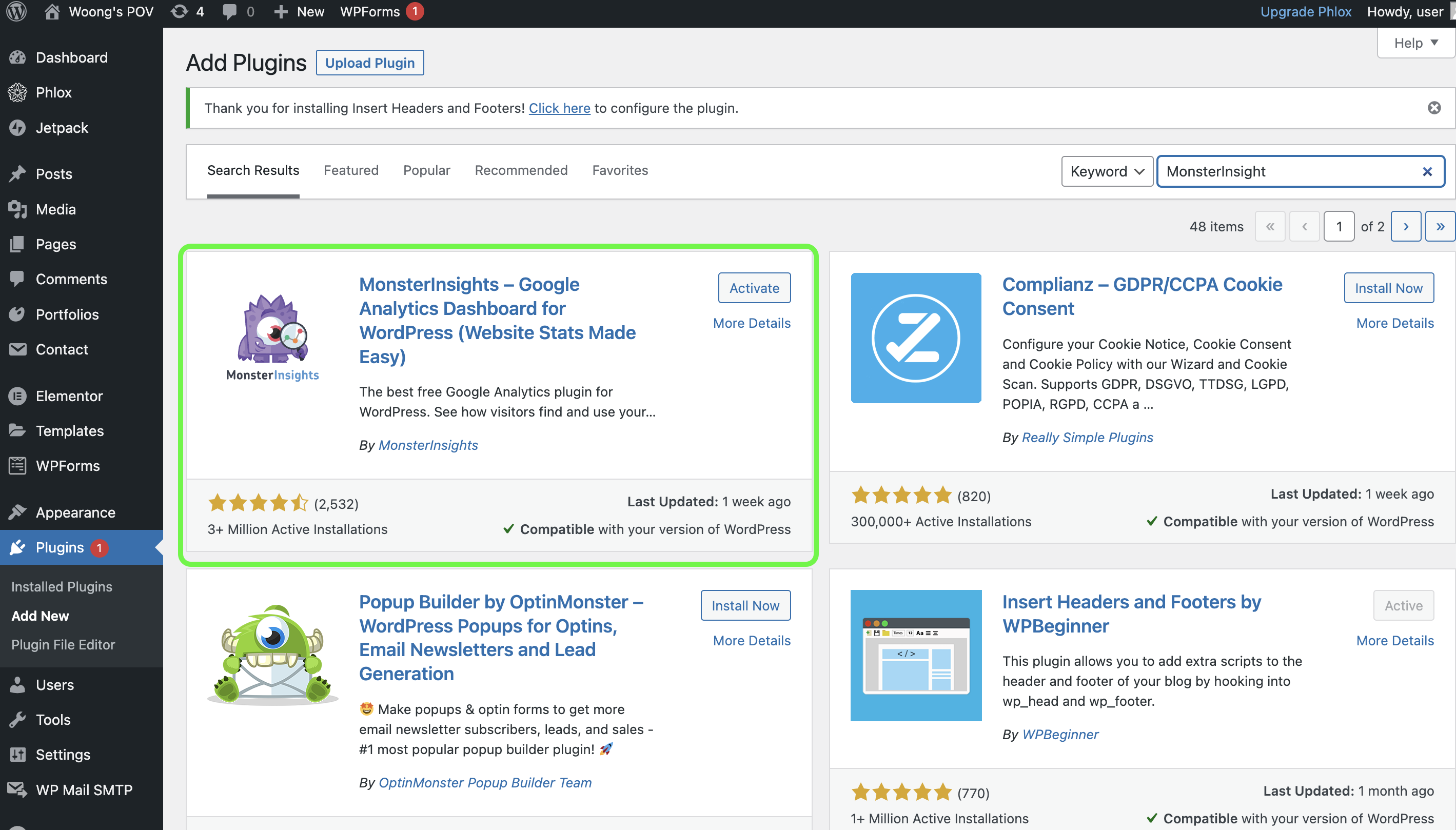 Plugin > Add New 버튼을 클릭하여 MonsterInsight를 검색 후, 설치해주세요. 설치 후에는 활성화를 하시면 바로 아래 화면과 같이 MonsterInsight의 세팅 마법사 화면으로 이동하게 됩니다.