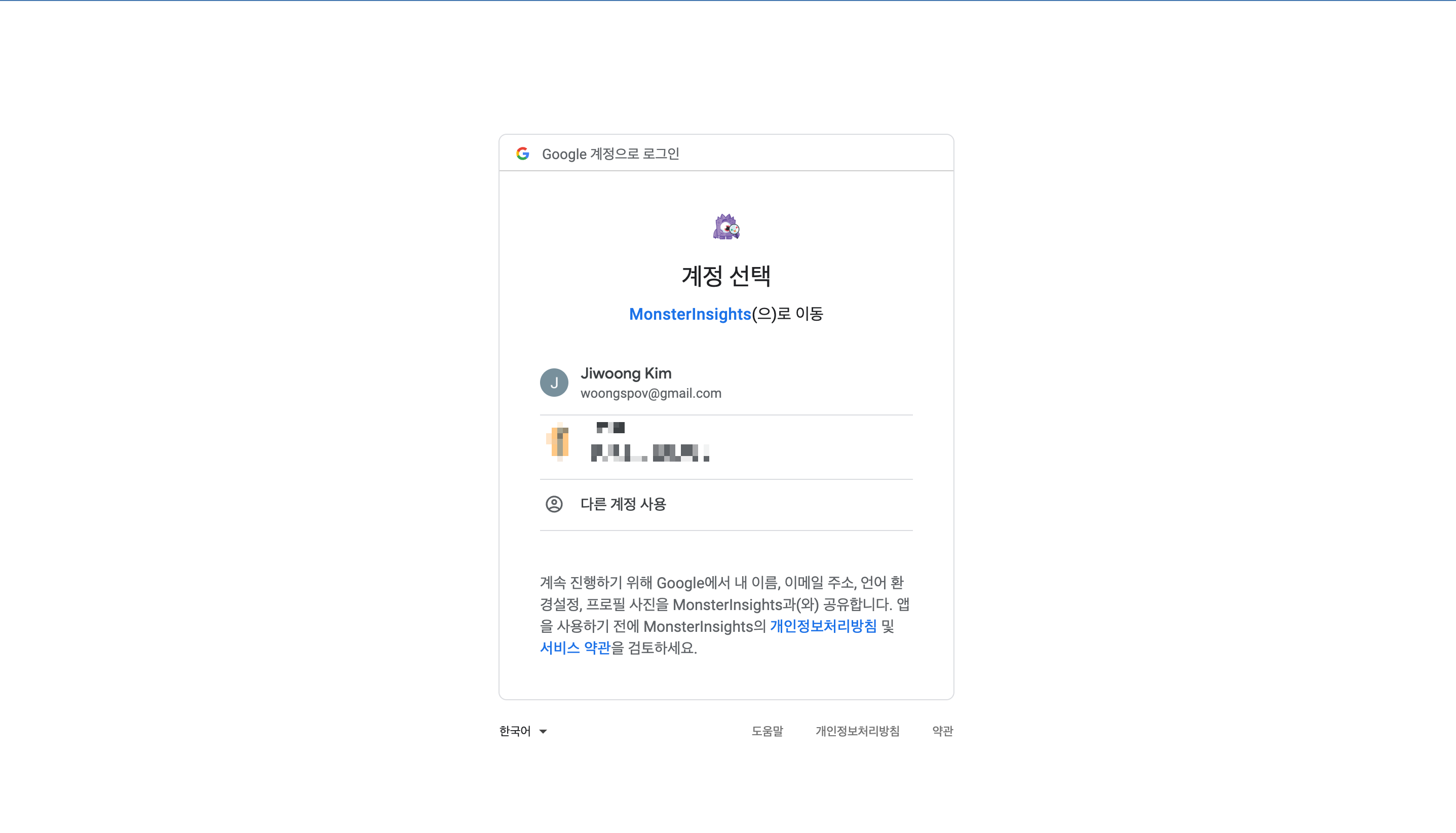 지난번 구글 애널리틱스 계정을 생성했던 구글 아이디를 선택해줍니다. 목록에 없다면 하단의 '다른 계정 사용' 버튼을 클릭하여, 지난 번 워드프레스 사이트와 연결한 구글 애널리틱스 계정이 있는 계정으로 로그인을 해주면 됩니다.