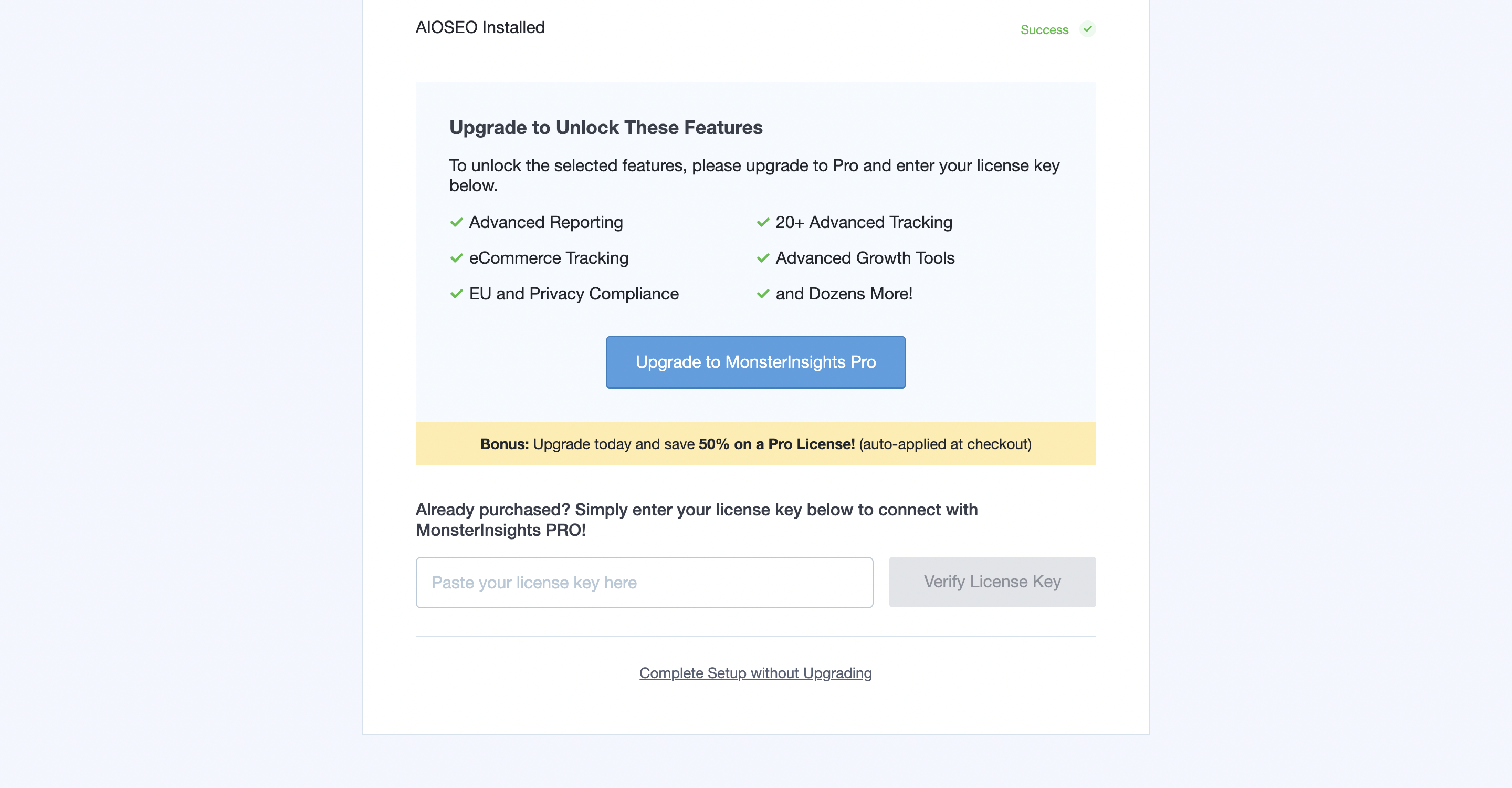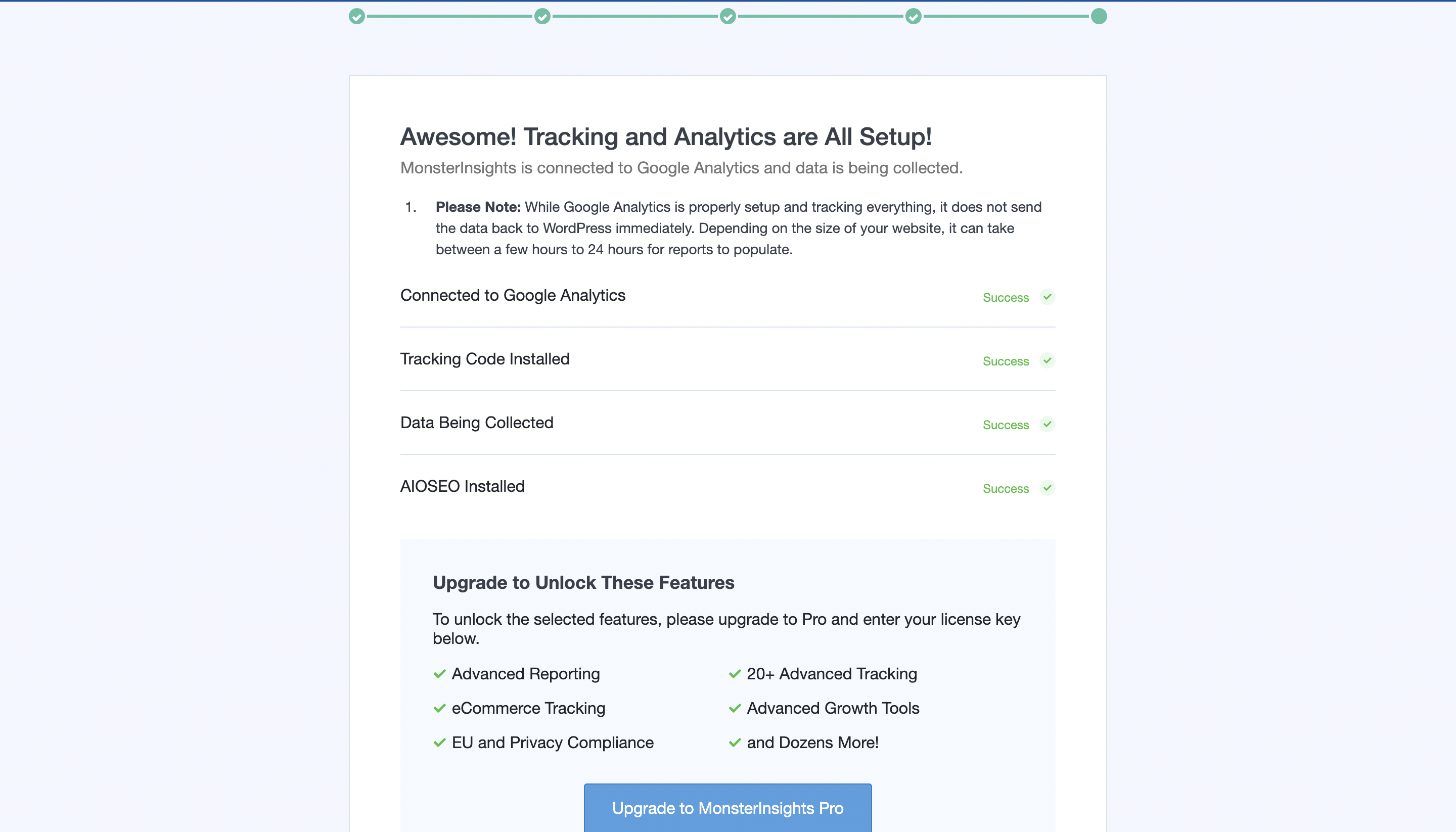 무료 버전에서 사용할 수 있는 기능들에 대해서는 세팅이 완료되었습니다. 밑에 보면 추가로 사용하고자 하던 기능들은 monsterInsights 유료 버전을 구매해야 사용 가능하다는 정보가 나옵니다.