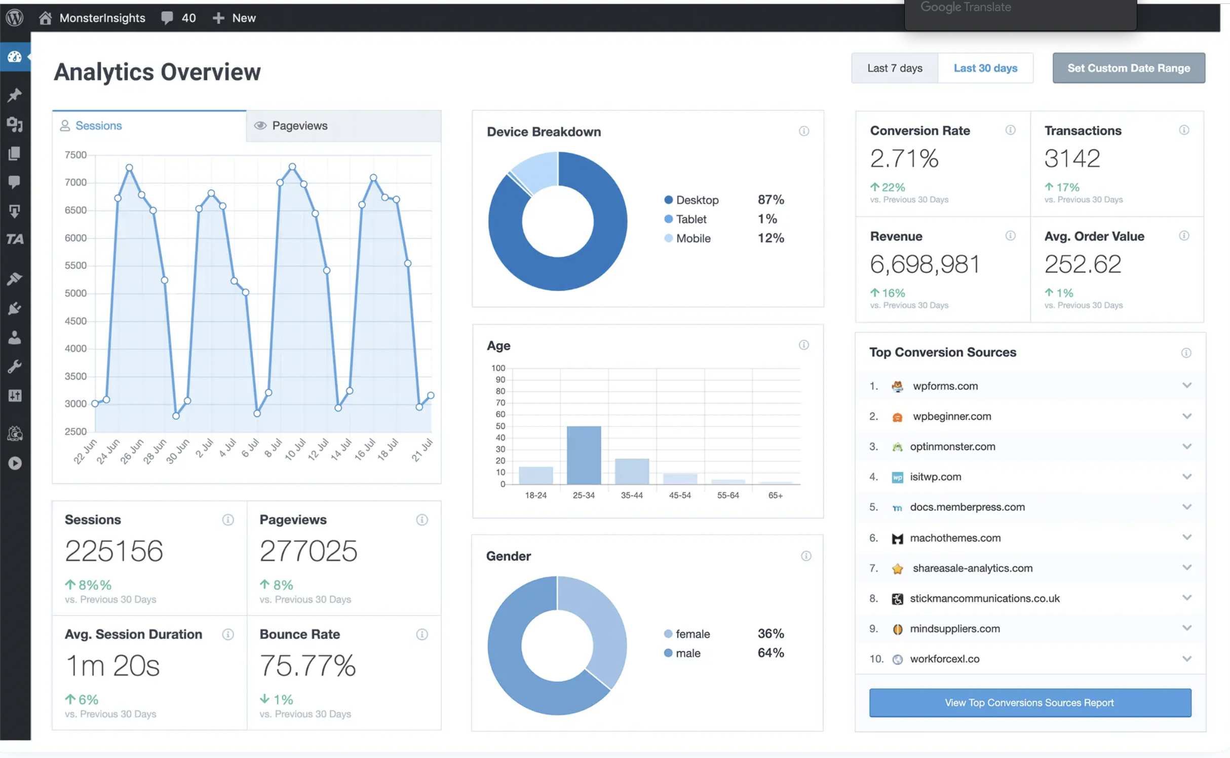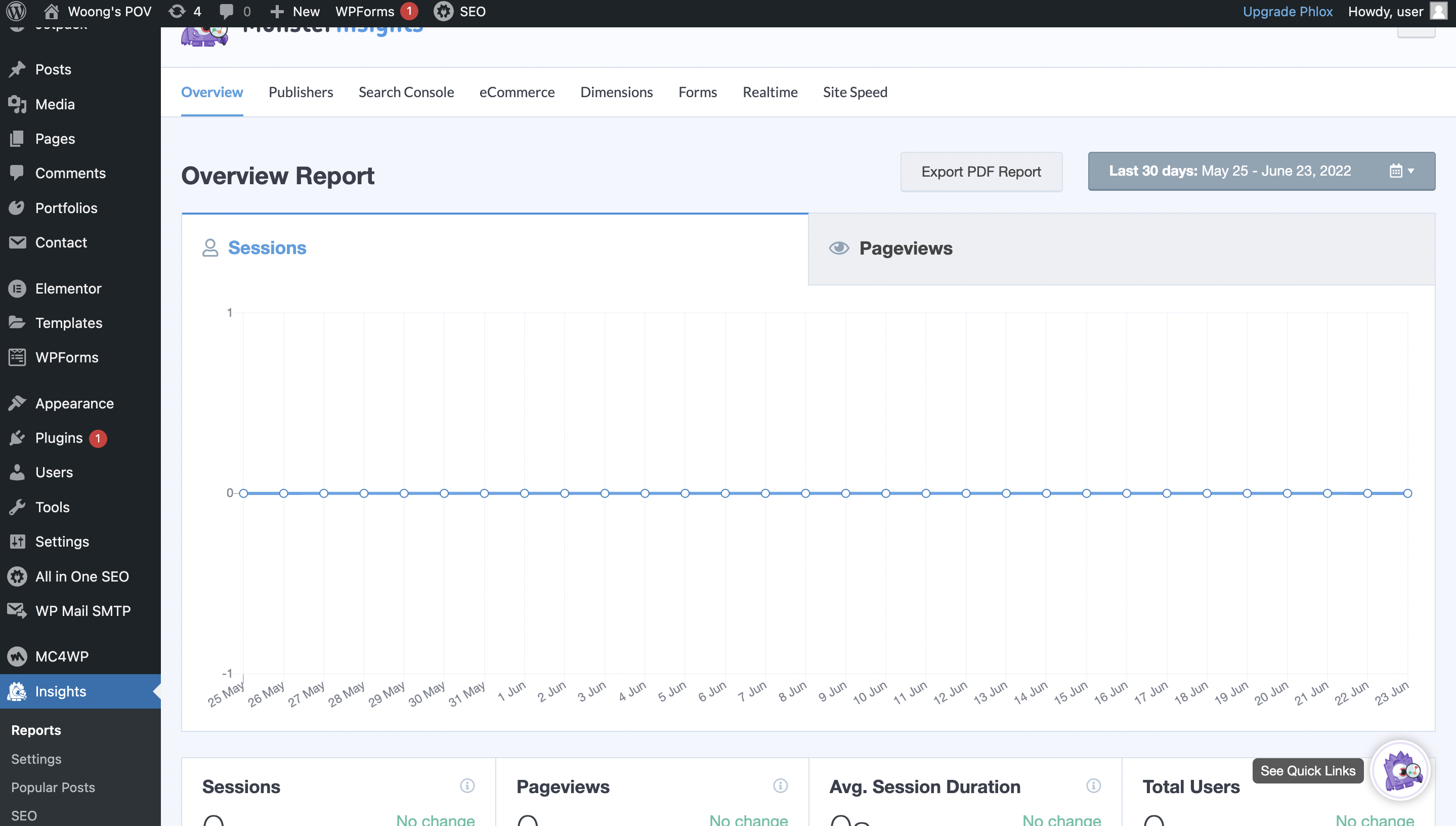 세션 수, 페이지 뷰, 평균 세션 지속 시간, 전체 유저 데이터는 이제 구글 애널리틱스를 통하지 않고서도 바로 워드프레스 관리자화면에서 확인이 가능해졌습니다. 리포트 우측 상단에 있는 기간 설정 탭을 통해 기간을 설정하면 해당 기간 동안의 데이터를 확인할 수 있습니다.