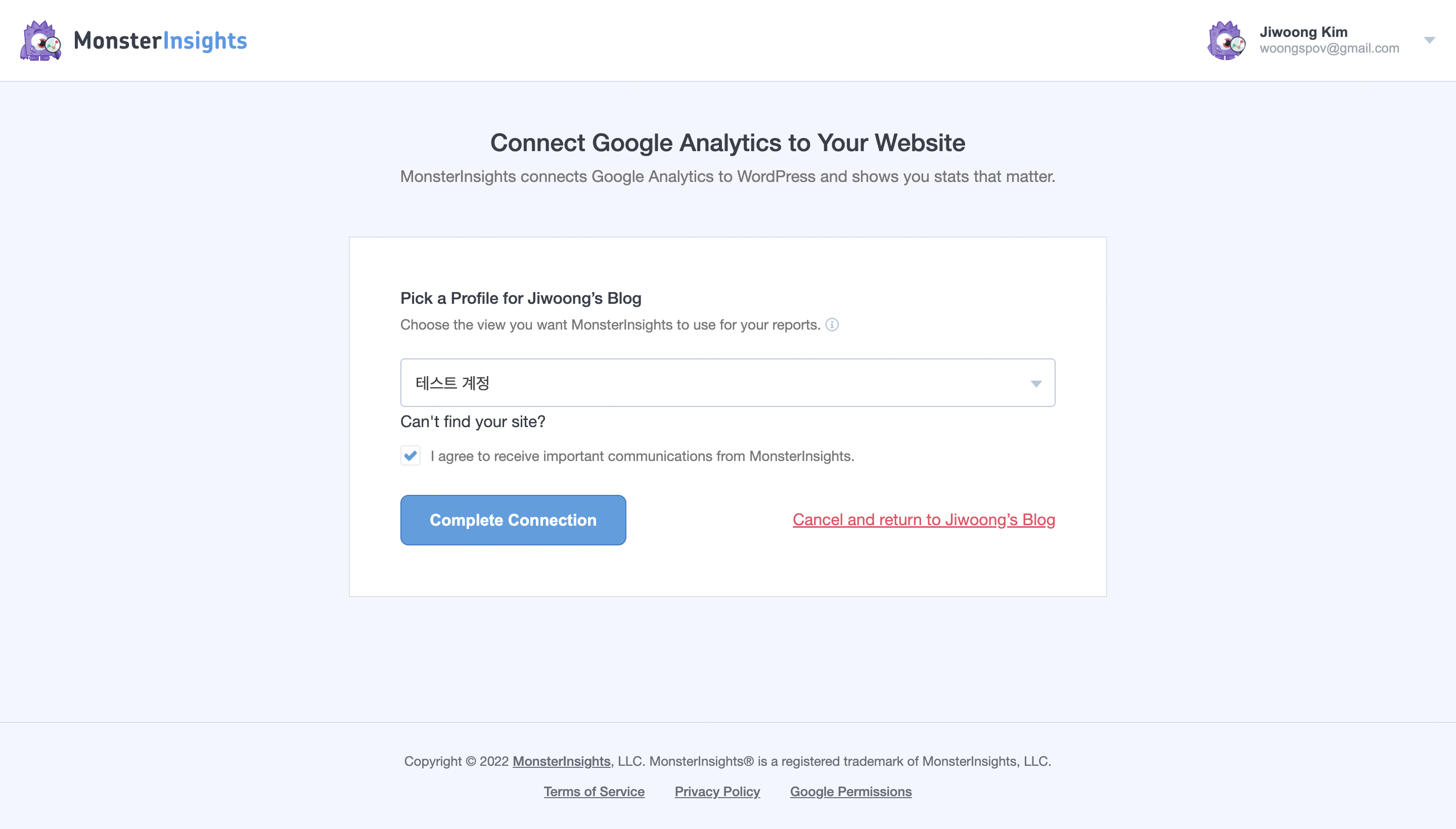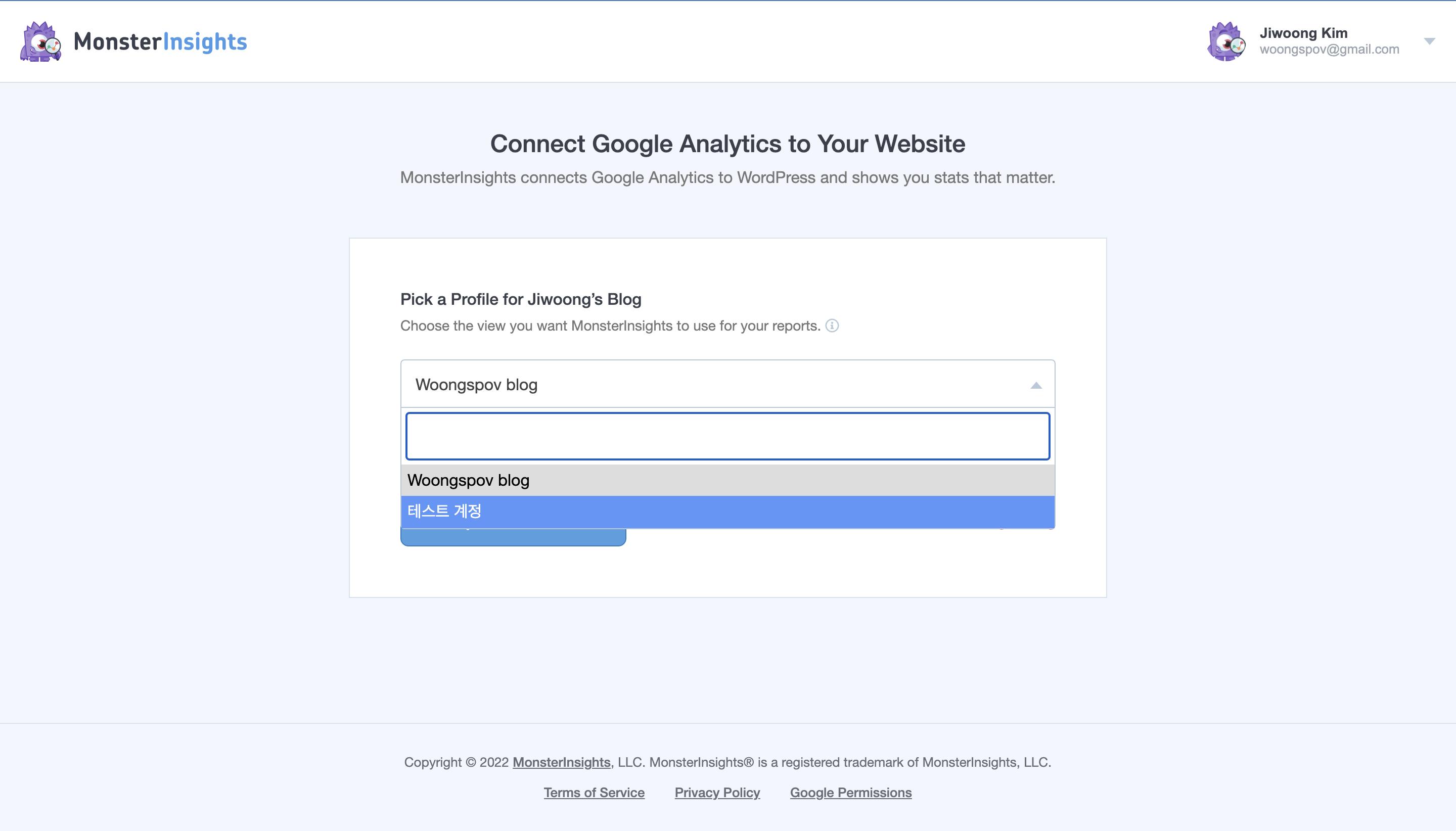 만약 저와 같이 복수의 구글 애널리틱스 계정이 있다면, 그 중, 지금 워드프레스 사이트를 위한 구글 애널리틱스 계정으로 만든 계정을 선택해 줍니다. 저는 '테스트 계정' 계정이 연결되어 있어서, 해당 계정을 선택합니다.