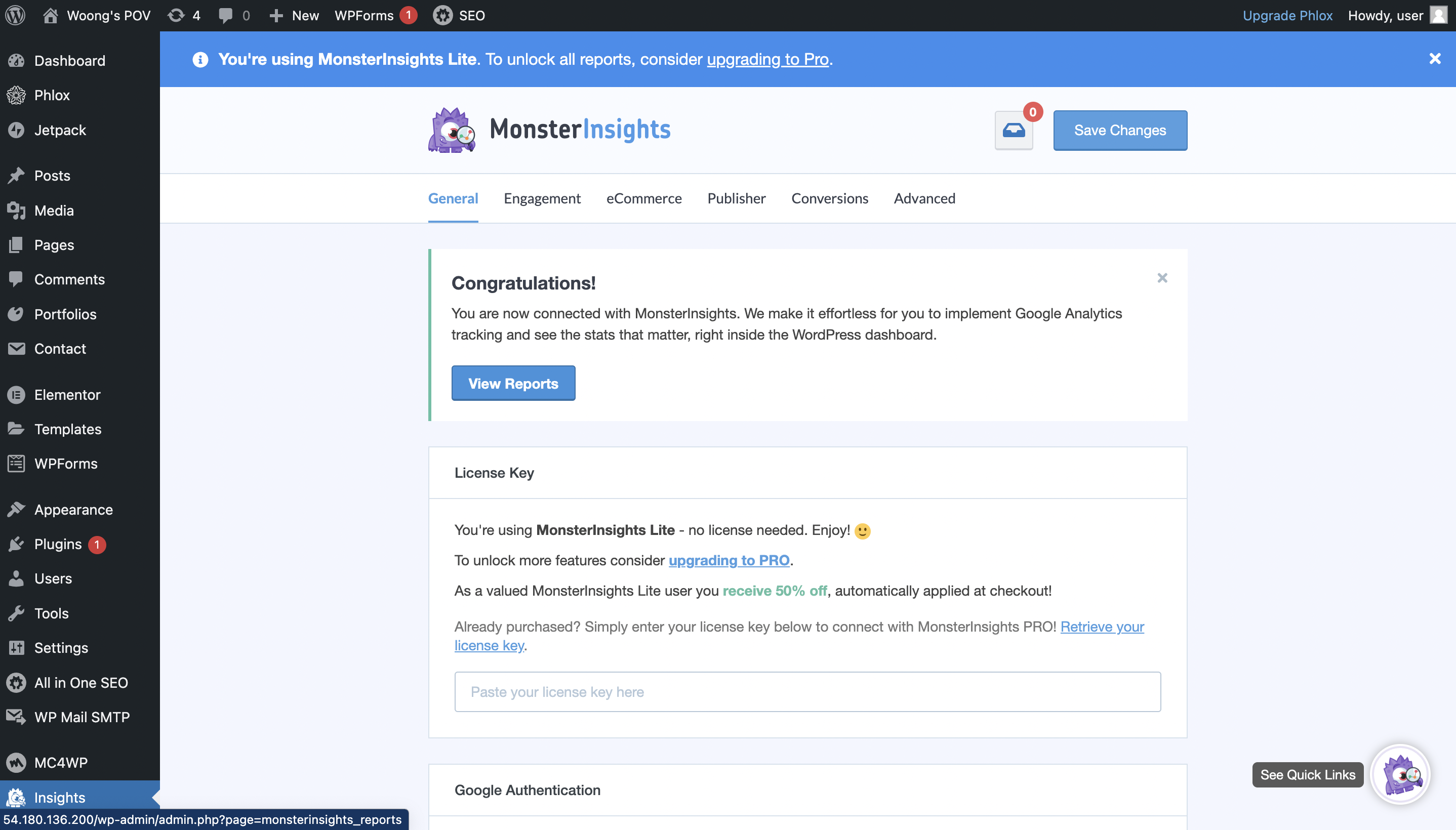 위와 같이 monsterInsights 플러그인과 제가 미리 만들어 두었던 구글 애널리틱스 계정과 간단히 연결 작업이 마무리됩니다.