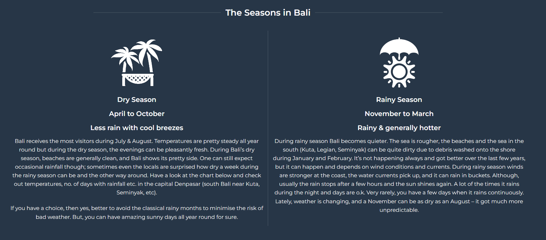 발리 공식 홈페이지에서도 건기와 우기를 언급해두었는데요. 건기는 4월부터 10월, 우기는 11월부터 3월로 작성되어 있습니다. 건기는 적은 비와 시원한 바람이 분다고 하며, 우기는 오히려 비가 오는데도 많은 비와 일반적으로 더 더운 기간이라고 작성되어 있습니다.