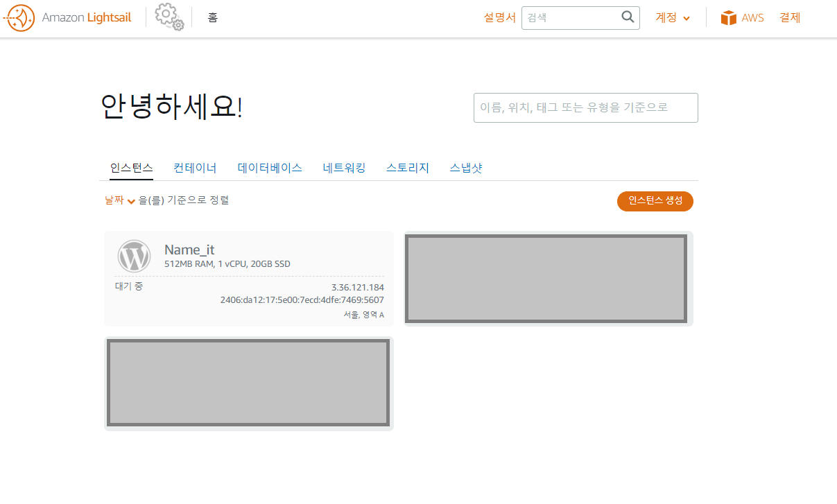 그렇게 인스턴스 생성을 진행하면 위와 같이 라이트 세일 홈 화면에 새로운 인스턴스가 생겨난다. 생성 후에는 보이는 것처럼 '대기 중'이라는 표시가 보이게 된다. 1분에서 2분 정도 기다리면 대기 중으로 표시된 부분이 '실행 중'이라고 바뀌면서 워드프레스 세팅을 위한 인스턴스 생성이 완료된다. 그 후에는 인스턴스의 이름을 선택해서 해당 인스턴스의 메인 홈 화면으로 들어간다.