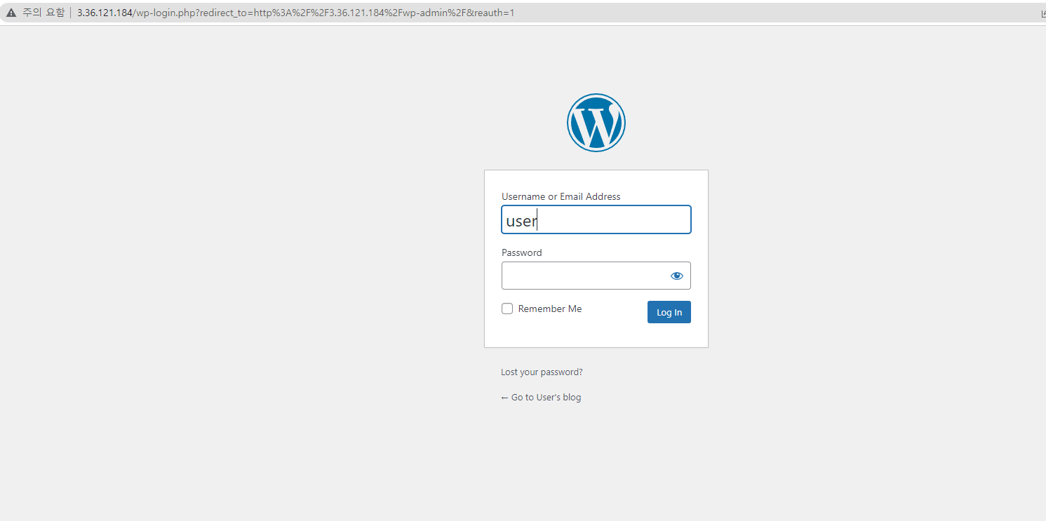해당 주소로 들어가게 되면 기본적으로 세팅되어 있는 워드프레스 웹사이트 메인화면이 나온다. 여기서 관리자 화면으로 들어갈 수 있도록 추가적인 URL을 퍼블릭 IP 뒤에 붙여주면 되는데 '/wp-admin'을 붙여주면 된다. 위의 샘플 URL을 예시로 든다면, 3.36.121.184/wp-admin이다. 그럼 아래와 같이 워드프레스 관리자 화면으로 들어갈 수 있는 화면이 나타나게 된다.