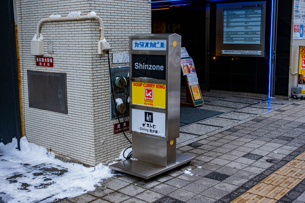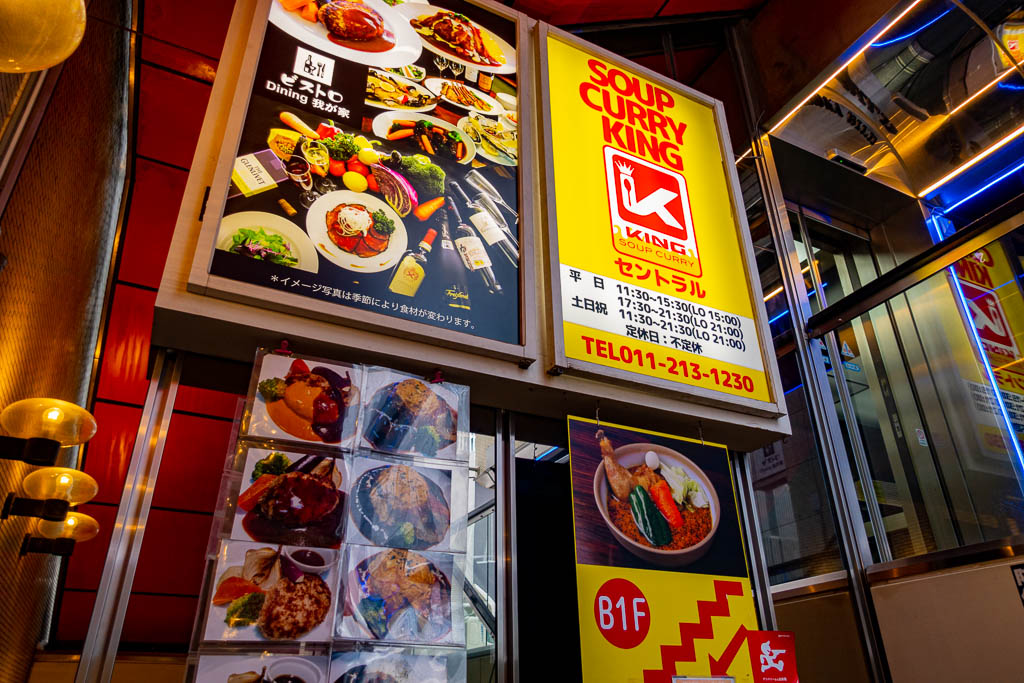 우리는 삿포로의 라장스테이 호텔에 머물렀는데, 라장스테이에서 가장 가깝게 있는 수프카레 식당이 바로 수프카레킹이었다. 조금 걷다가 큰 대로를 한 번 건너면 바로 수프카레킹에 도착할 수 있었다. 호텔에서 도보로 5분 정도 거리였던 것 같다. 큰 대로를 건너면 바로 노란색 배경에 빨간 글씨로 'Soup Curry King' 이라고 써있는 간판이 보이는데, 지하 1층에 식당이 있다.