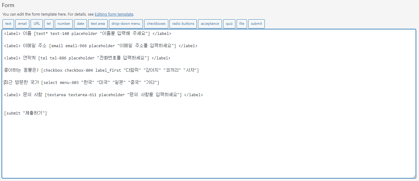 (참고:필자는 우선 기본적으로 뜨던 양식 안의 텍스트를 모두 지웠다. 최하단에 있는 [submit "submit"] 버튼만 사용해야 하기에 남겨두었으며, 모든 작업을 처음부터 보여주고자 한다)