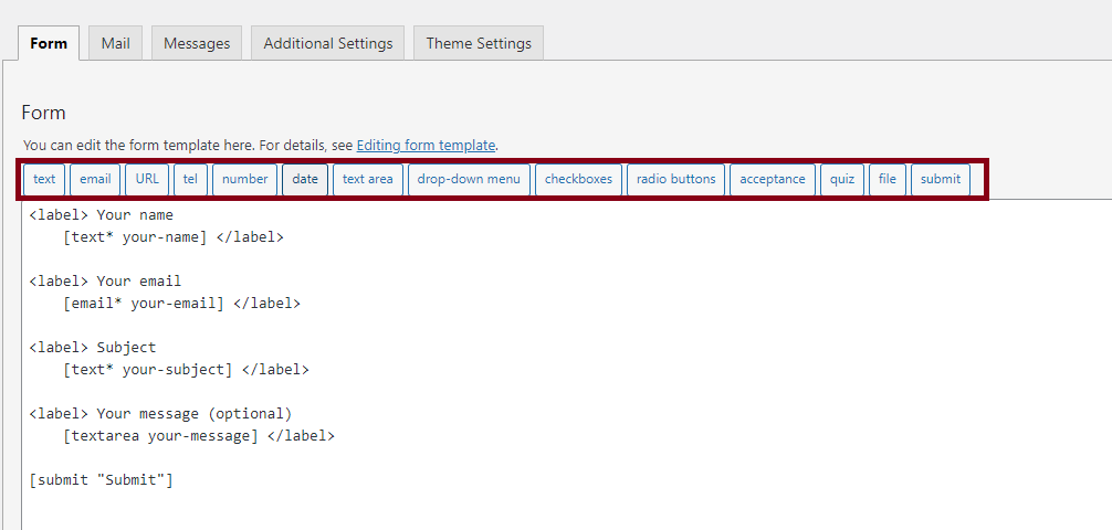 양식을 설정하는 화면의 중간 부분에 보면 위와 같이 빨간색으로 표시한 부분에 여러 가지 버튼들이 있다. Text, email, url 등 버튼이 있다. 눈썰미가 있다면 빠르게 파악했을 것 같다. 바로 태그를 직접 텍스트 코드로 입력해서 방법이 아닌 shortcut으로 세부 사항만 입력하면 양식에 삽입하고자 하는 코드를 생성해서 바로 넣어주는 기능이다.