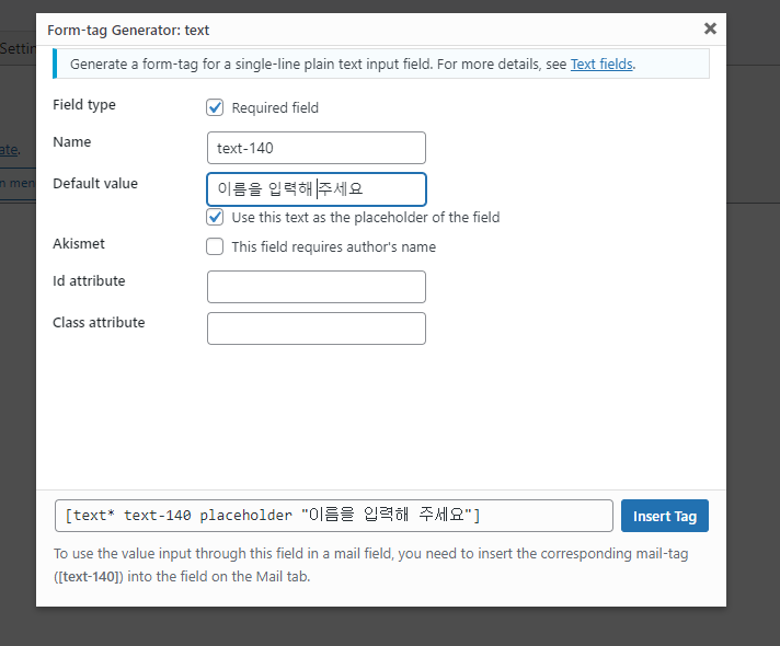 그럼 이제 직접 원하는 내용을 입력하여 양식을 만들어보자. 우선 text 버튼을 클릭하여 텍스트 항목을 양식에 넣어보자. text 버튼을 클릭하게 되면 위와 같은 창이 뜰 텐데, 여기서 각 항목을 하나하나 잘 설정해주면 바로 아래 보이는 insert tag 버튼을 눌러서 태그를 넣을 수 있다.