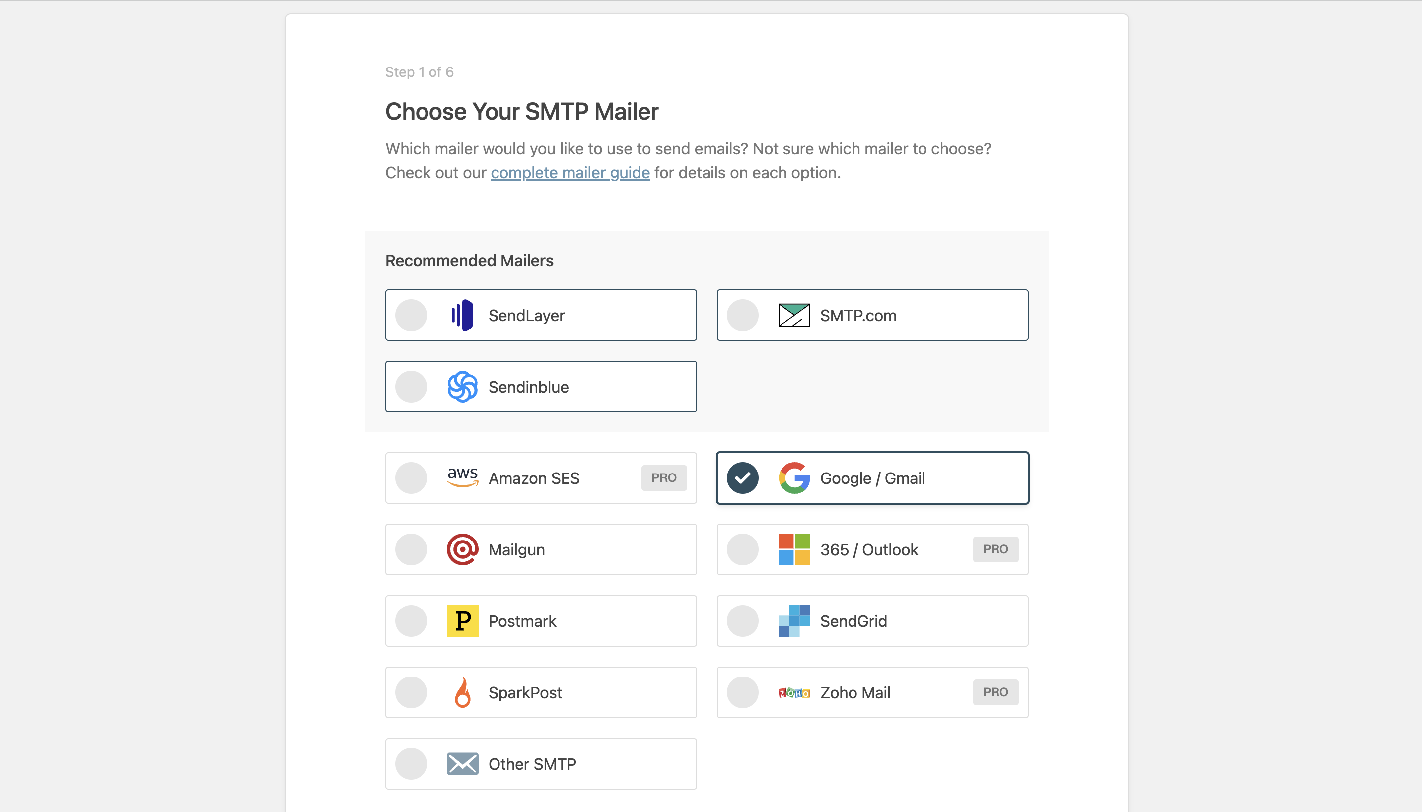 설치 후, 활성화를 하게 되면 좌측에 WP MAIL SMTP 메뉴가 생긴다. WP MAIL SMTP > Settings 메뉴로 들어가면 중간에 있는 Mail 항목에 Launch Setup Wizard라는 버튼이 있다. 이 버튼을 클릭하면 WP MAIL SMTP 세팅 마법사 페이지로 넘어간다.