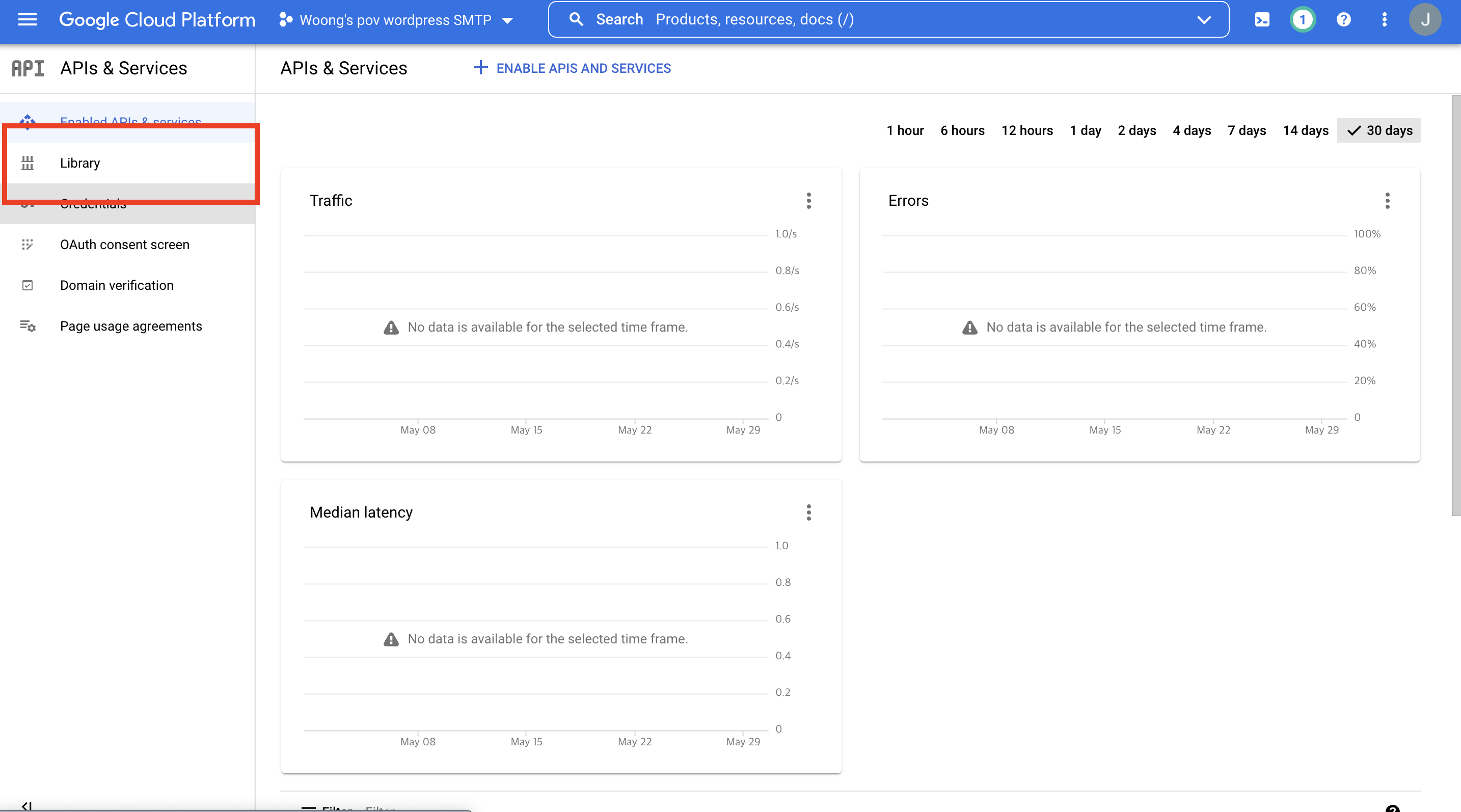 가입 완료 후, 구글 클라우드 콘솔에서 API & Service라는 화면을 찾아 들어간다. 아마 바로 보일 것이다. 그리고 좌측에 보이는 Library를 선택한다.