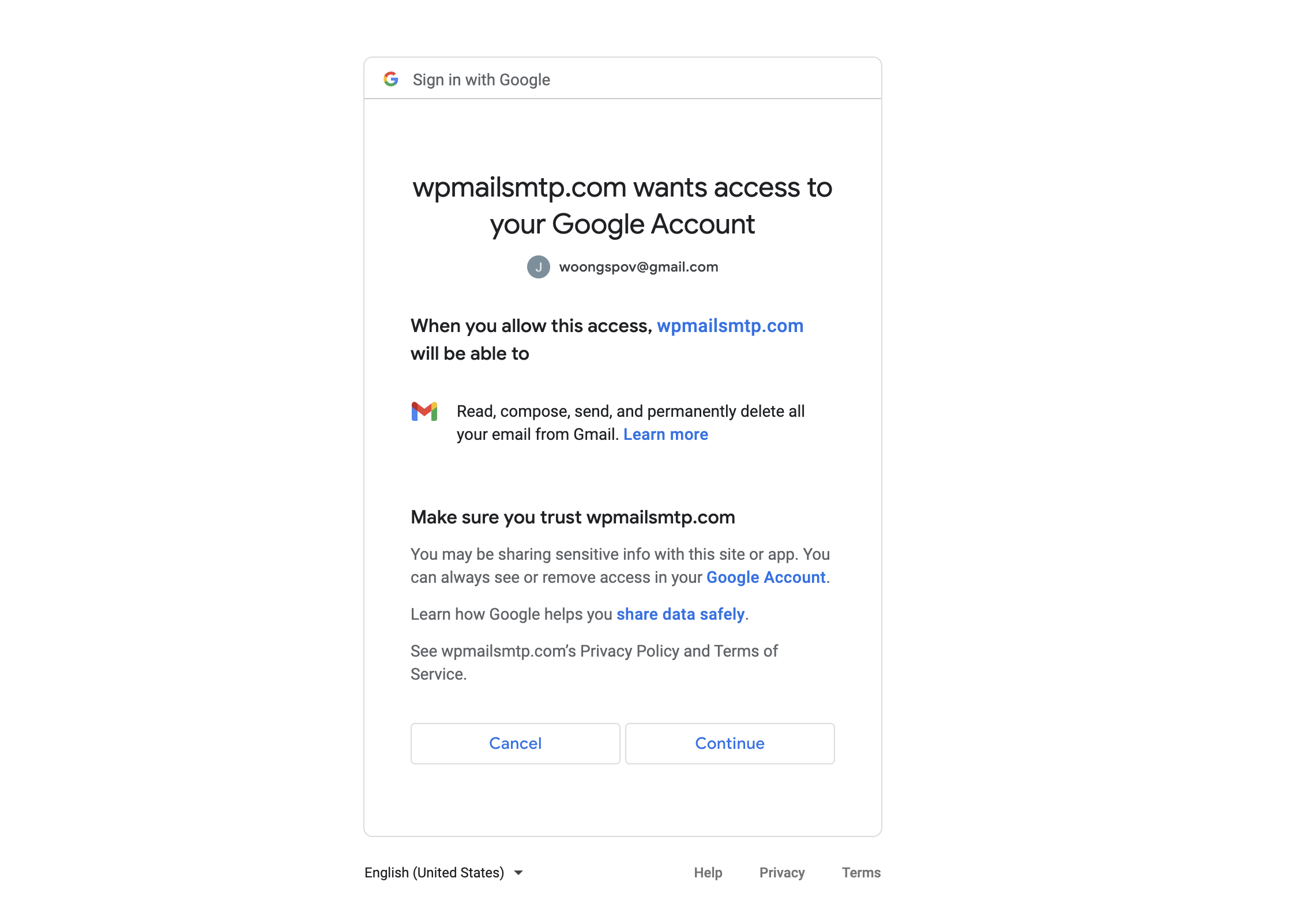 Continue 버튼을 눌러서 WP MAIL SMTP 플러그인이 방금 필자의 구글 클라우드 콘솔에서 생성한 gmail api를 사용하는 것을 동의해준다.