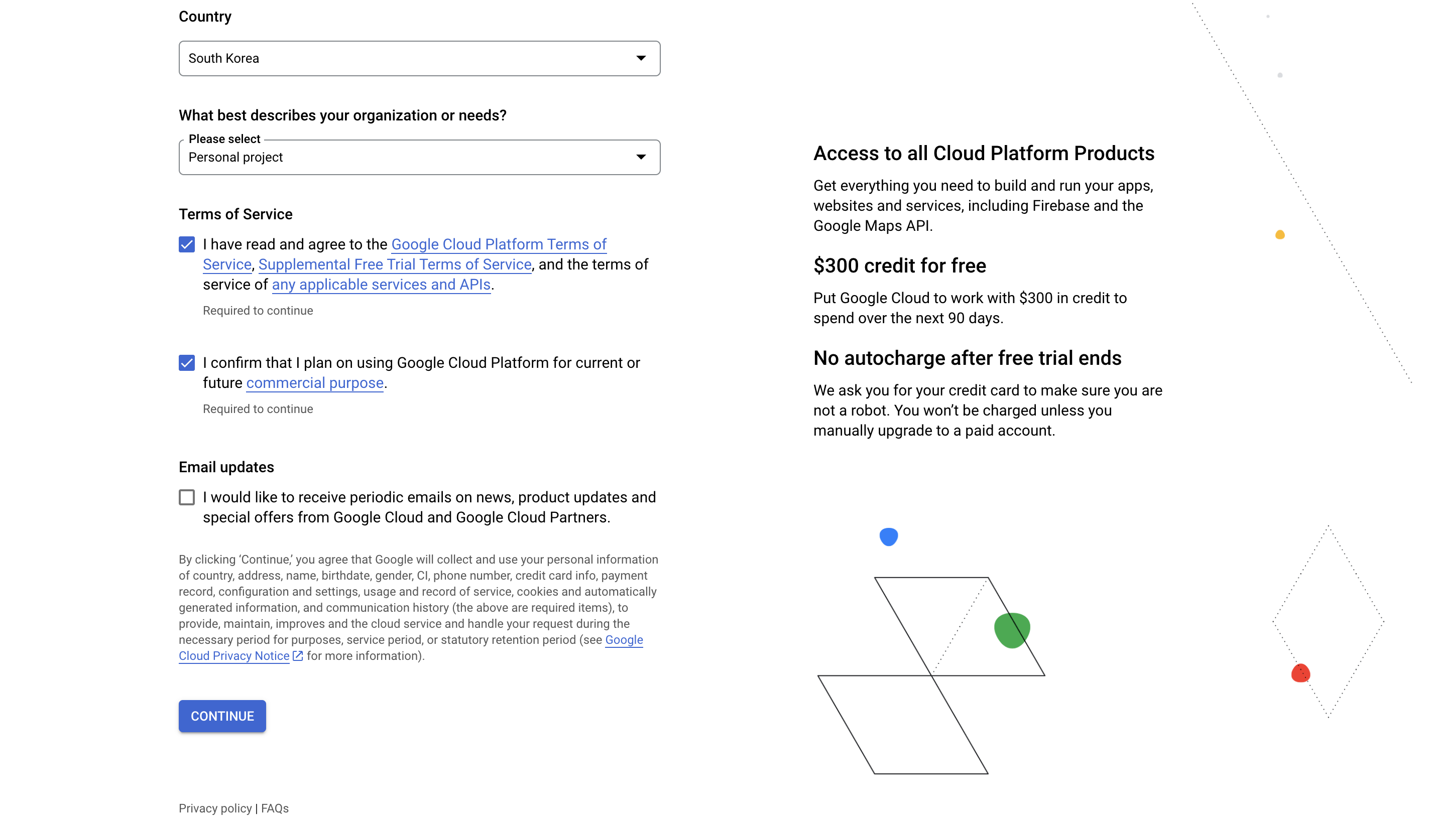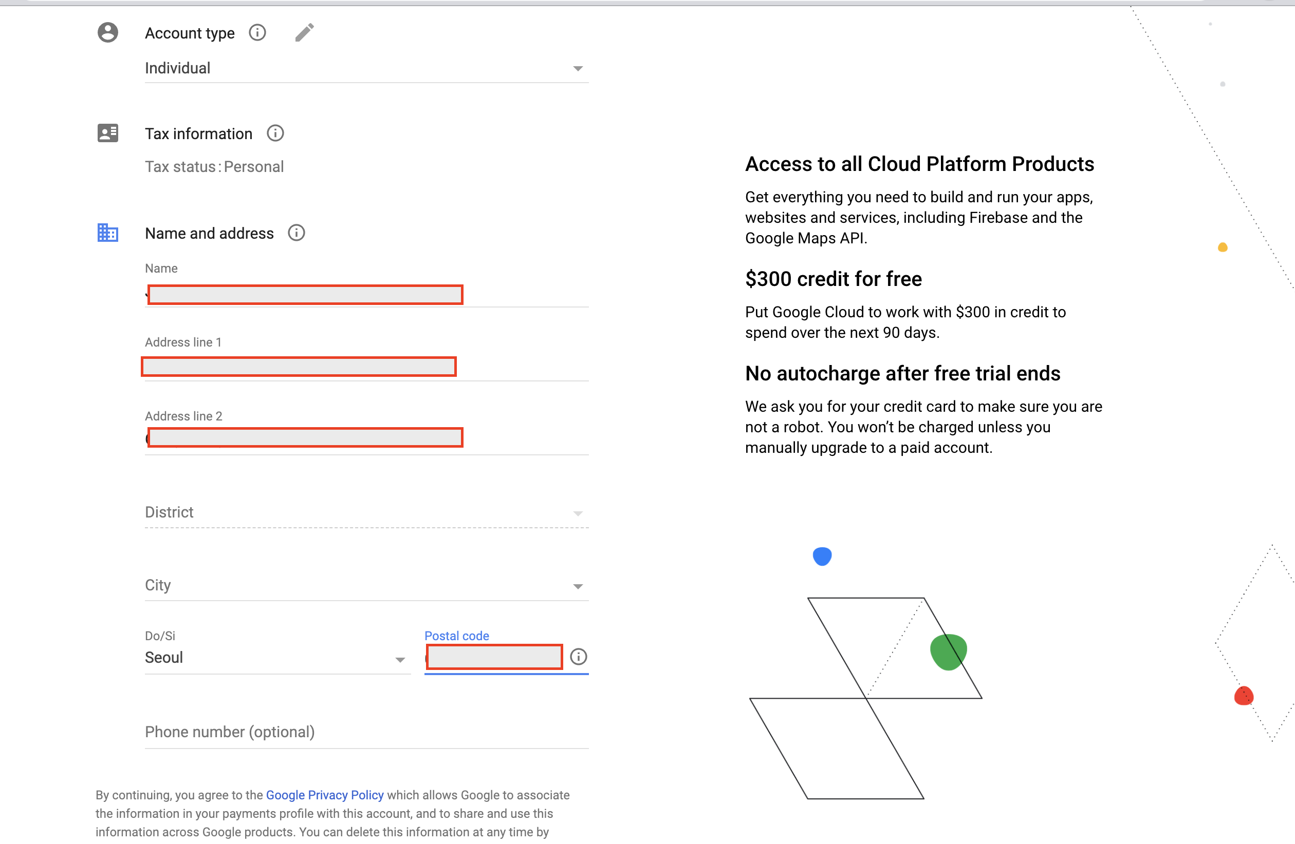 account type의 경우는 개인(individual)으로 선택했다. 그리고 아래 주소지와 정보 입력을 해준다. 진행 과정에서 카드 정보를 입력하도록 하는 과정이 나오는데 구글 클라우드 콘솔을 사용하려면 필수로 입력을 해줘야 해서 카드 결제 정보를 넣어준다. 별도로 과금이 되는 건은 없기에 필자는 입력해주고 최종적으로 클라우드 플랫폼 가입을 완료했다.