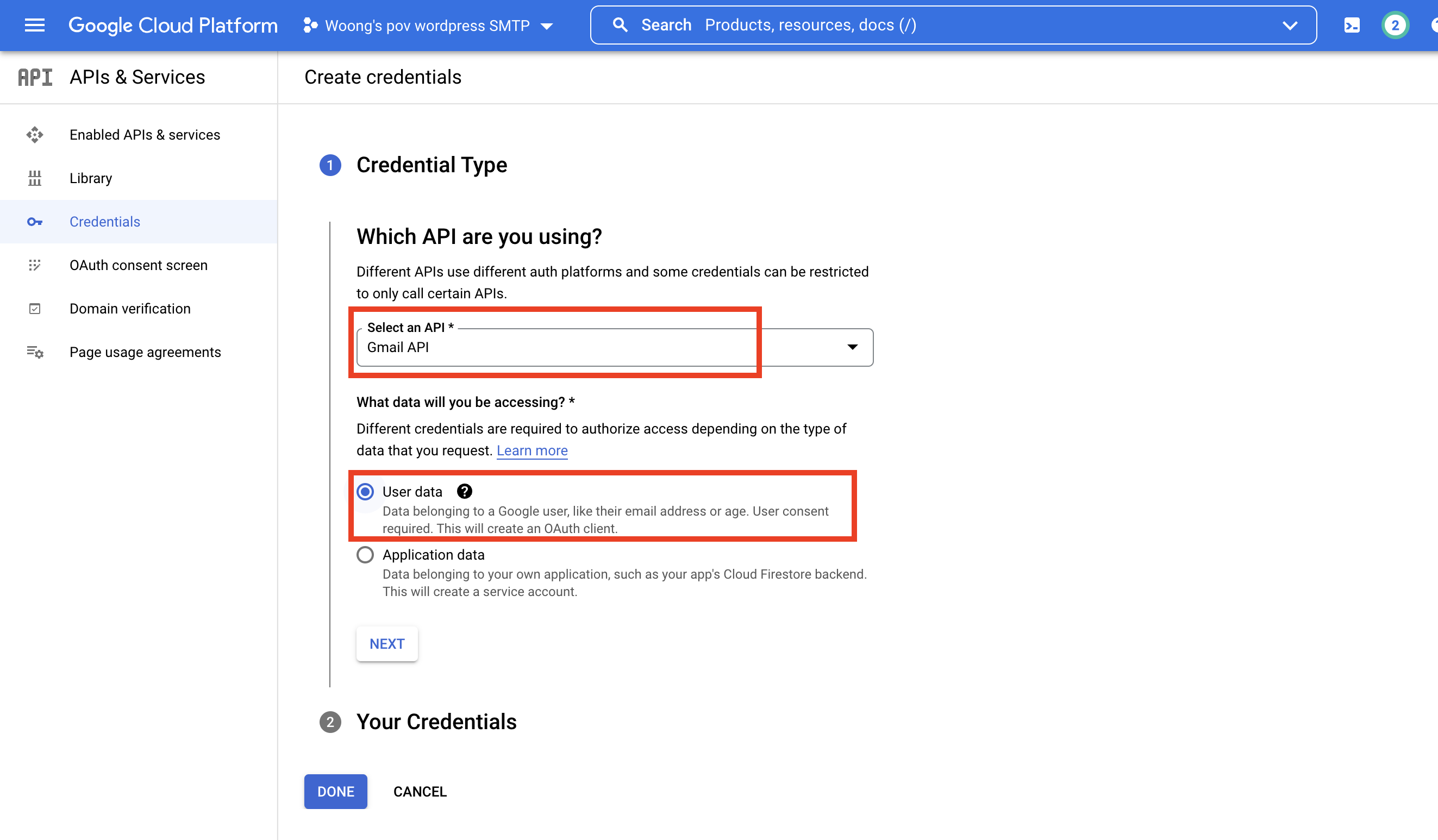 위와 같이 select an API 항목에서 gmail API를 선택하고 하단에 보이는 항목에서 User Data를 선택한다. 그리고 done 버튼을 누른다.
