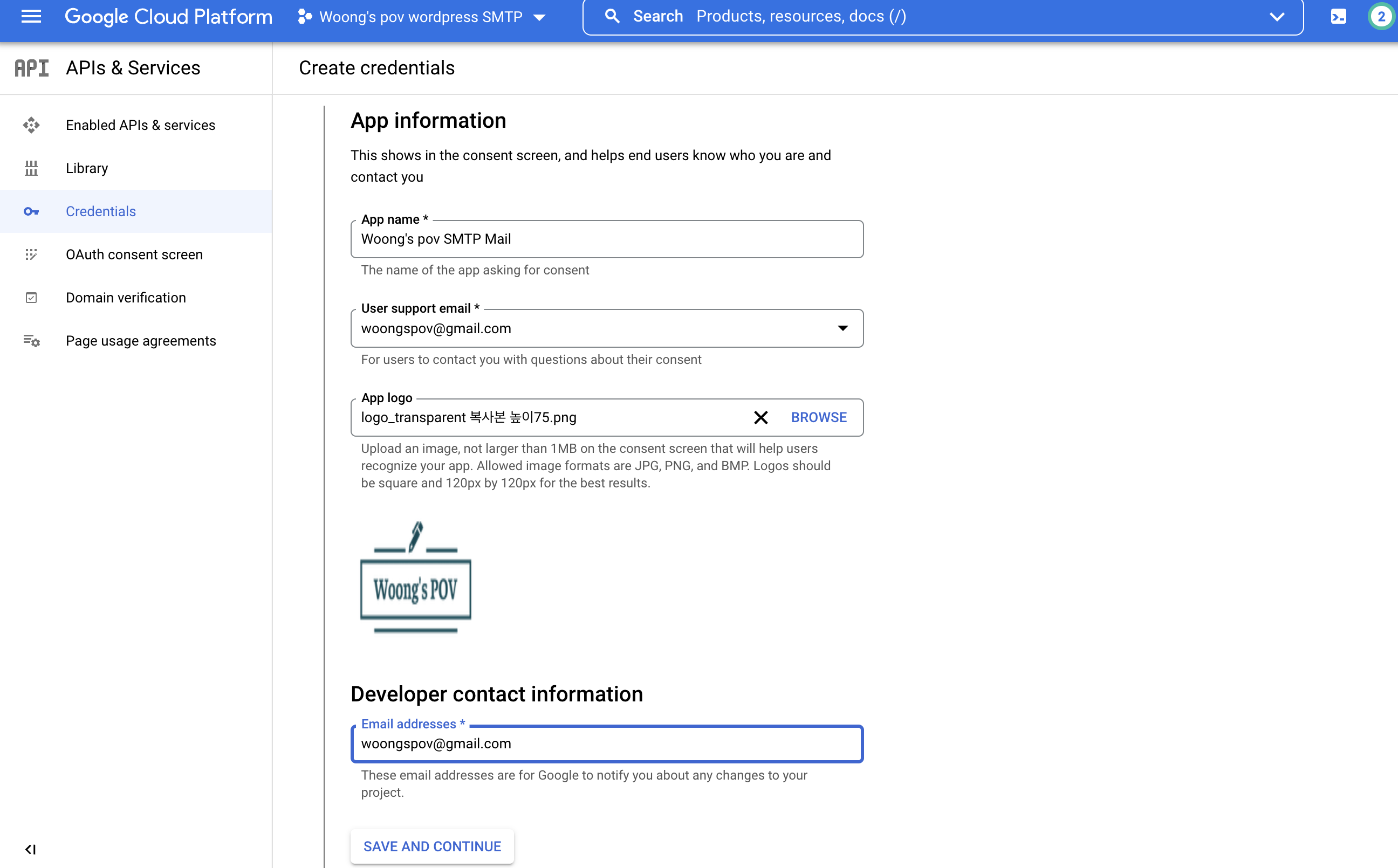 credential 세팅 과정에서 app information이라는 화면이 나오는데 여기서 나중에 어떤 용도로 사용한 credential인지 확인하기 쉽도록 관련된 정보를 입력해준다. 필자는 나중에 또 다른 웹사이트 용도로 gmail api를 만들 수도 있기에, 이 API는 이번에 만드는 테스트용 웹사이트를 위한 정보로 알아보기 쉽게 입력해줬다. 정보가 입력되었으면 save and continue 버튼을 클릭한다.