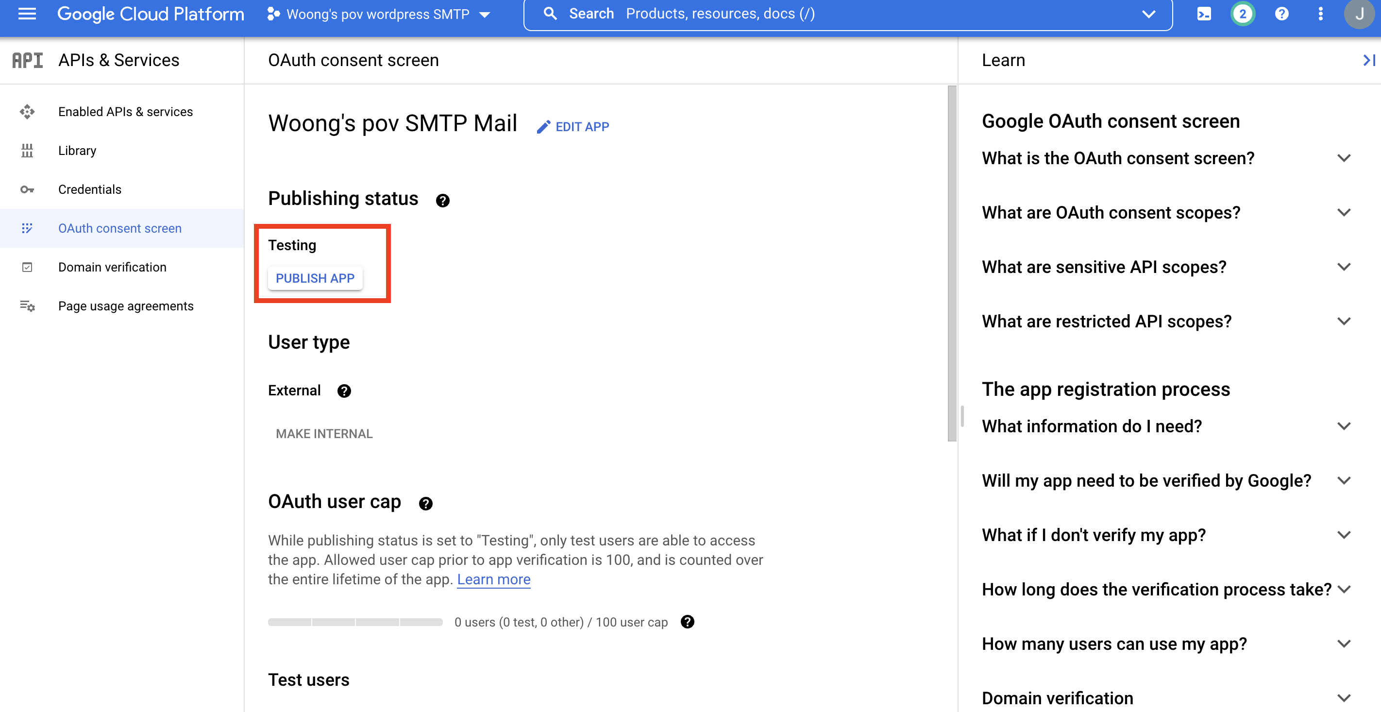 API 생성을 위한 최종 과정이 끝났다면 좌측에 보이는 OAuth consent screen 메뉴를 선택하고 중간에 보이는 Publishing status의 testing 항목에 보이는 publish app 버튼을 클릭해준다. 방금까지 만들어 둔 API를 실행시켜서 사용될 수 있도록 하는 작업이다.
