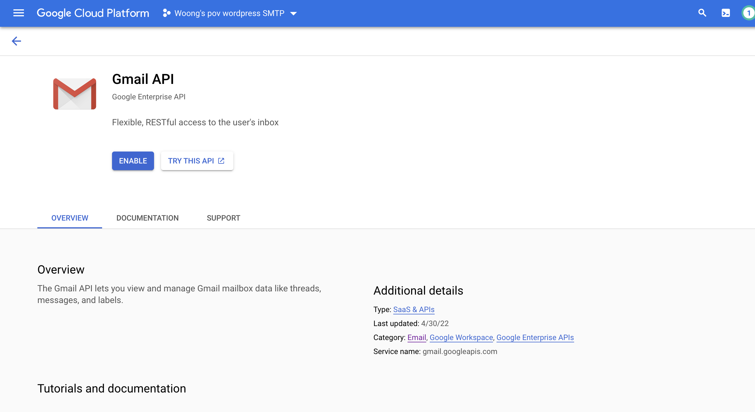 email을 선택하면 Gmail API항목 하나가 뜨는데 해당 항목을 선택하자. 위의 화면에서 Enable 버튼을 클릭해서 지메일 API를 활성화해준다.