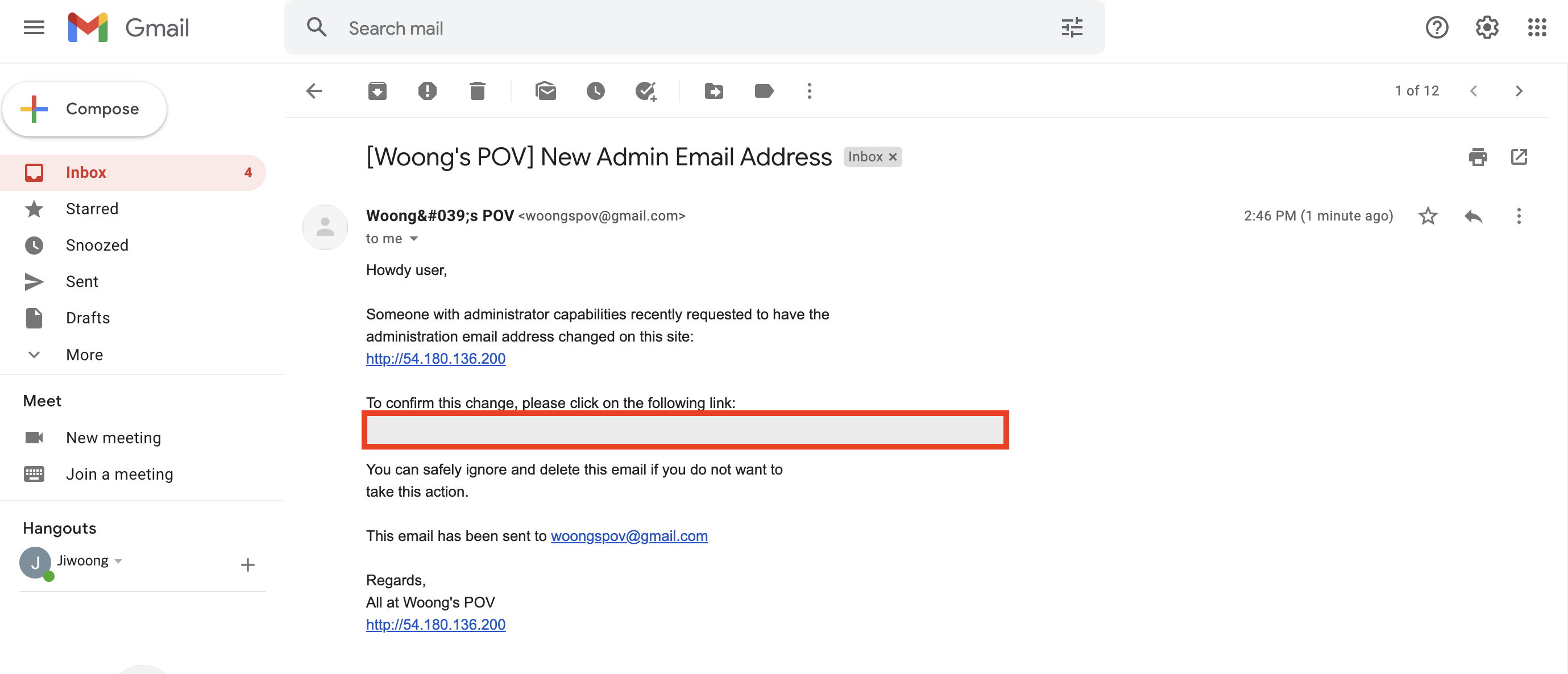 위와 같이 관리자 메일 변경을 위해 Settings > General 메뉴에서 관리자 메일을 변경 후, 저장을 하자 변경한 메일 주소에서 컨펌을 해야 최종적으로 관리자 메일이 변경된다는 안내가 나온다. 이제 시스템에서 메일이 발송되었는지 변경하고자 하는 관리자 메일에 들어가서 확인해보자.