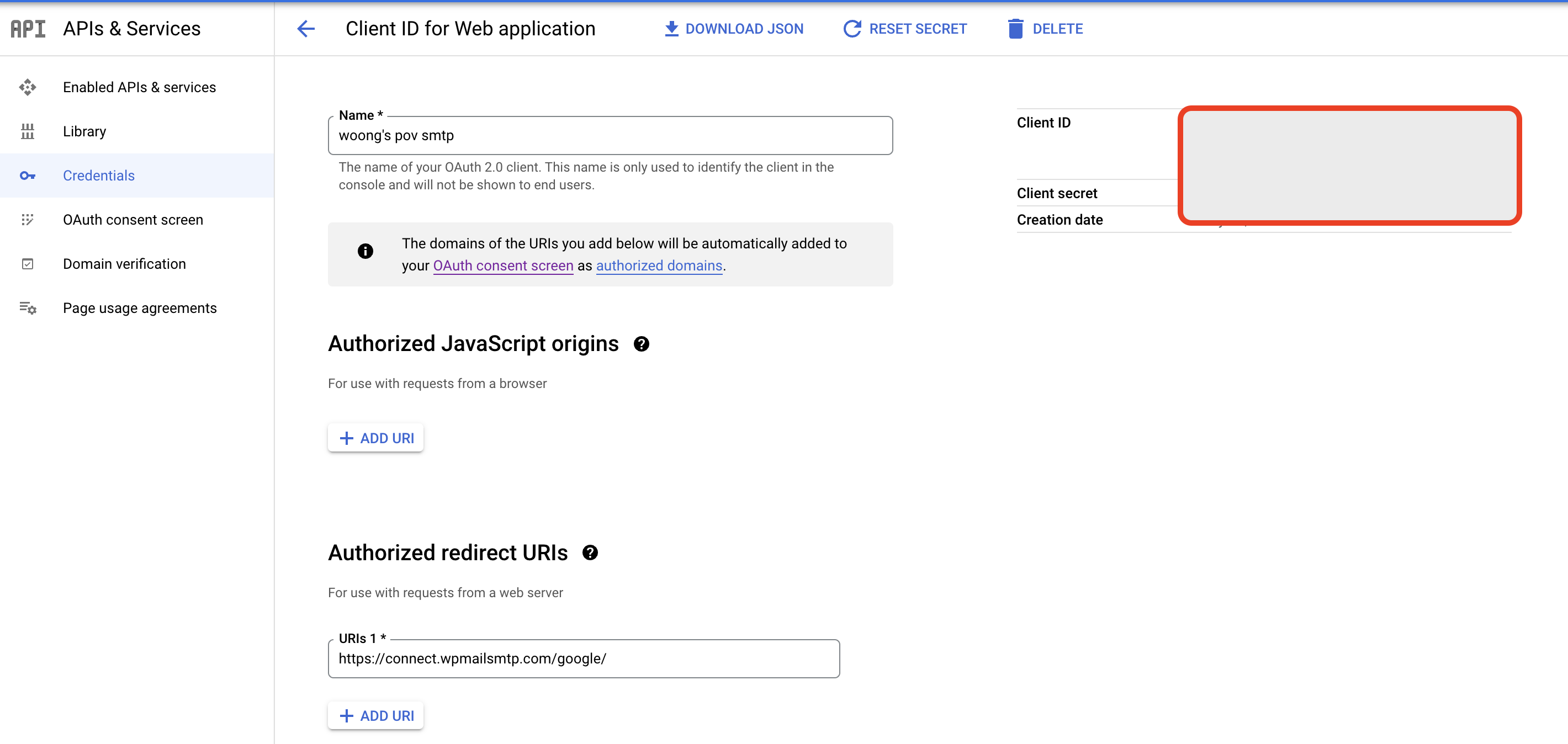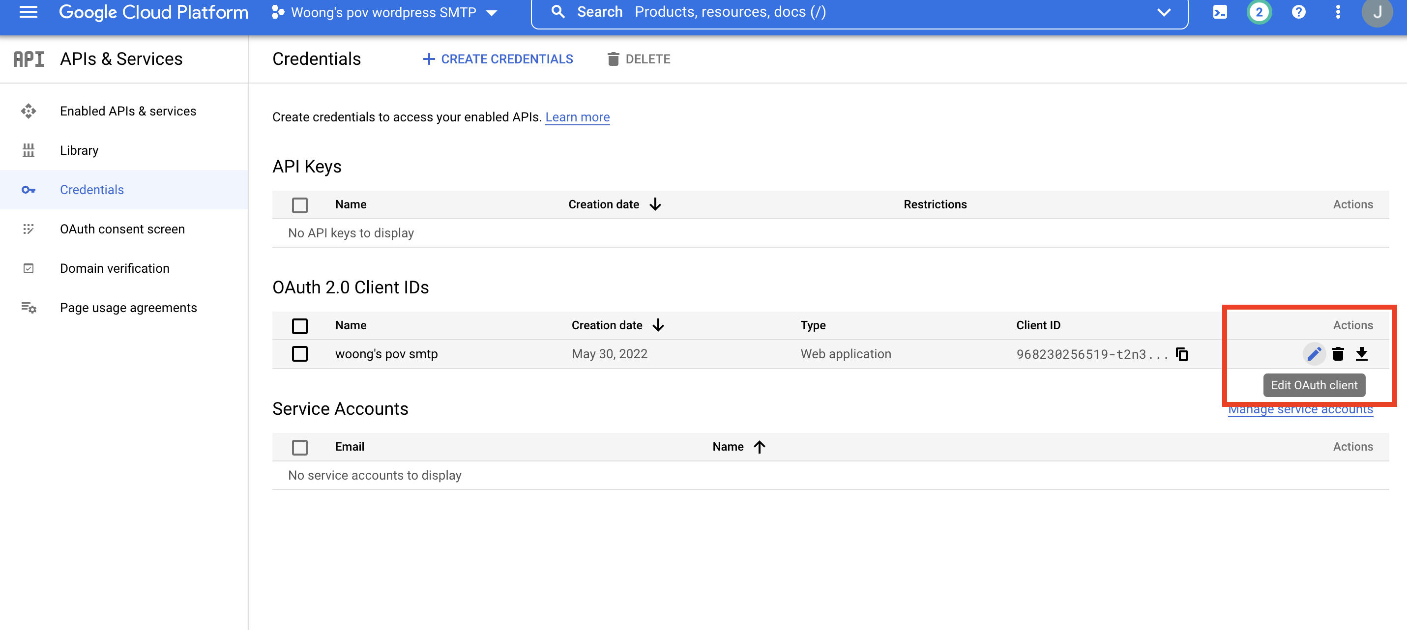 연필 표시를 클릭하고 들어가면, 우측 상단부에 클라이언트 아이디와 시크릿 넘버를 확인할 수 있다. 이 각각의 넘버를 가장 처음 단계인 WP MAIL SMTP 플러그인 설치 마법사 화면에 있던 입력란에 입력해주면 된다.