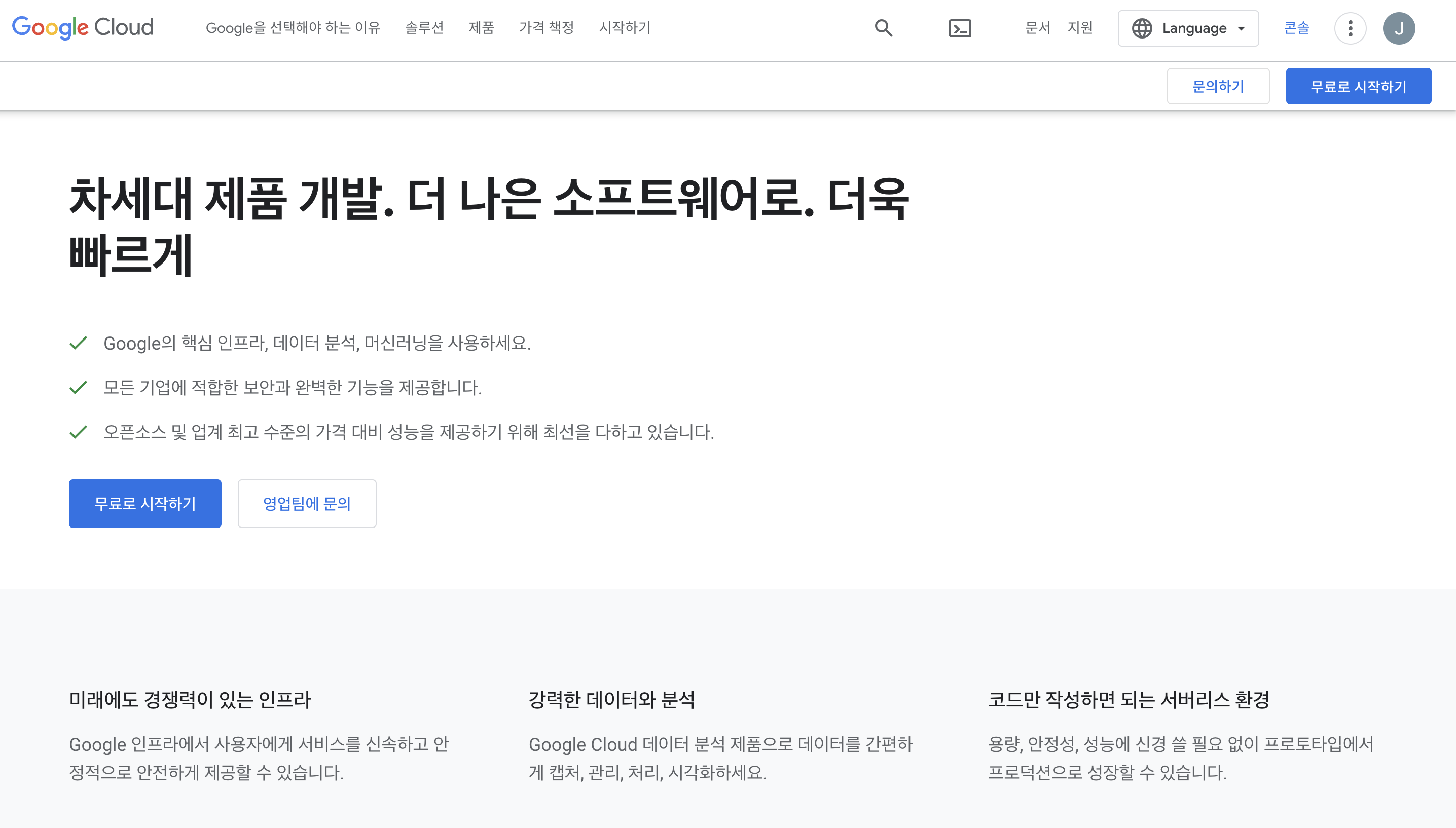 진행 과정을 잘 따라서 가입을 하면 위와 같이 구글 클라우드 콘솔 메인 페이지로 들어가게 된다. 여기서 무료로 시작하기 버튼을 클릭한다.