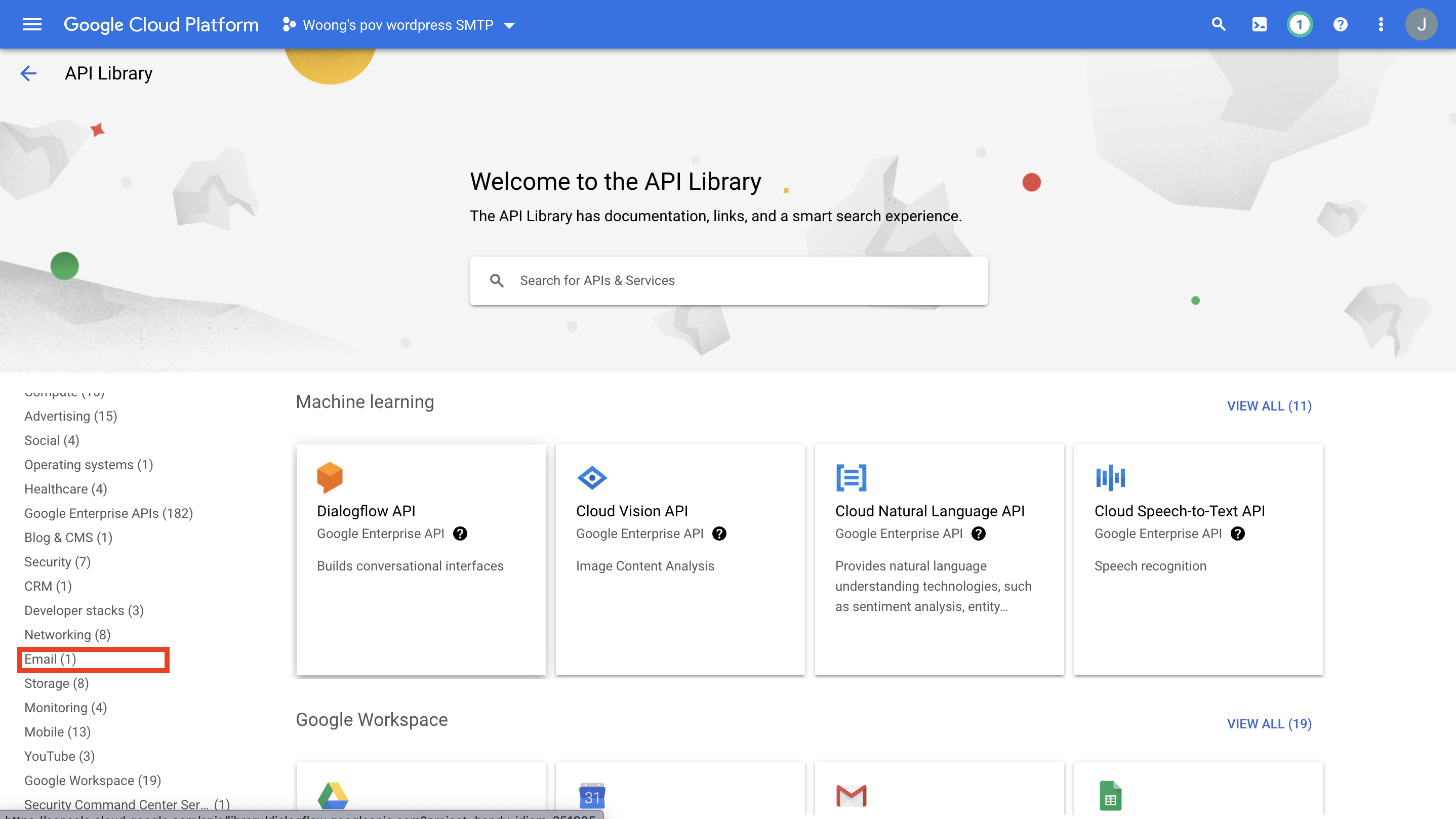 라이브러리의 좌측에 보면 구글 클라우드 플랫폼에서 제공하는 모든 API의 유형이 있다. Email 항목을 선택하자.