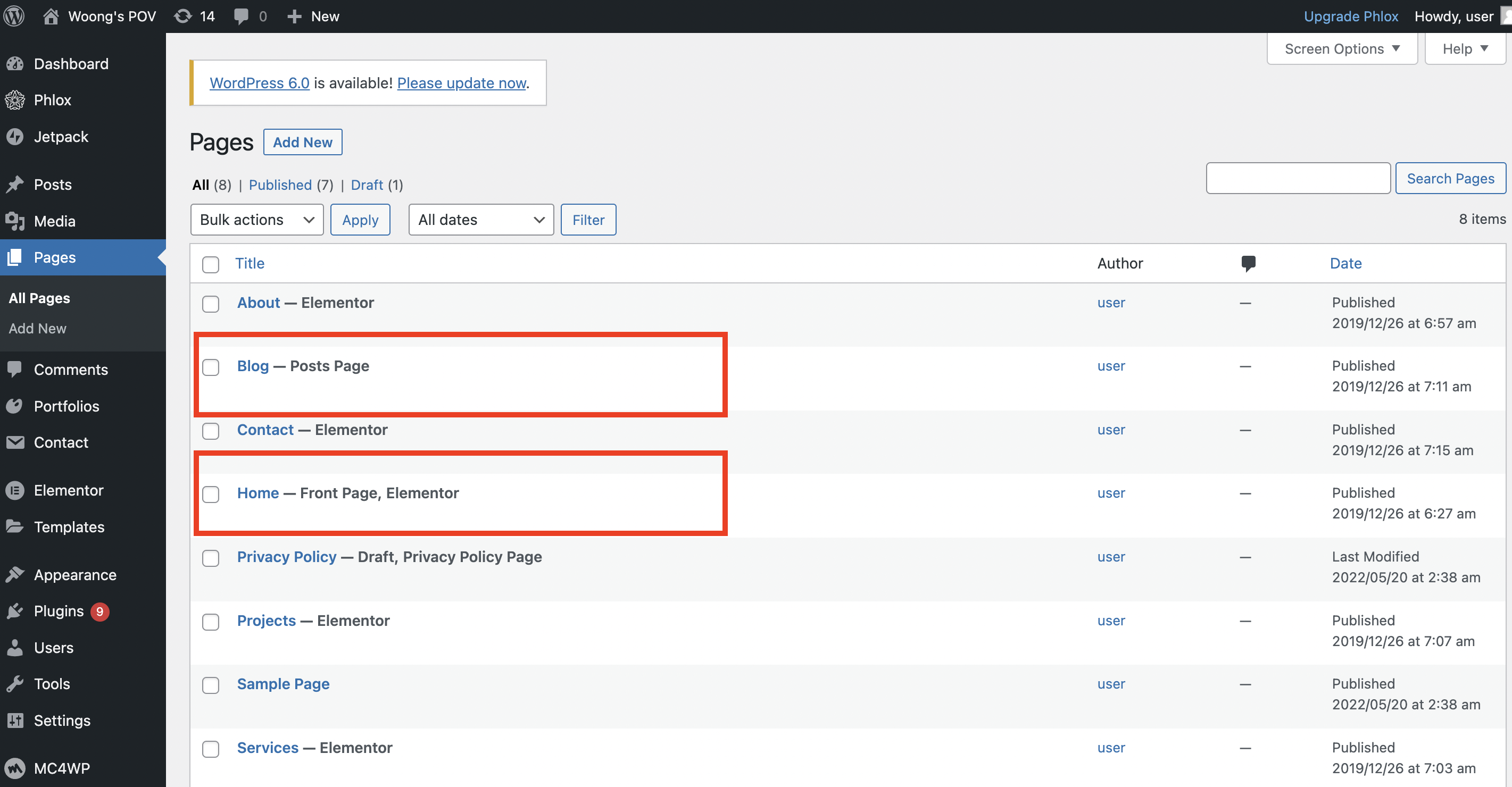 우선 위에 언급한 것처럼 데모 설치 시 들어온 불필요한 글들을 보이지 않도록 처리해주자. Title 옆에 체크박스를 체크하고, 위에 edit을 선택 후, Apply를 눌러준다. 그러면 우측에 status라는 항목이 생기는데 여기서 Draft를 선택하여 업데이트 버튼을 눌러준다. 굳이 삭제하지 않는 이유는, 혹여나 나중에 글의 레이아웃이 괜찮다면 복사를 해서 동일하게 사용할 수 있기 때문에 불필요하게 글의 수가 많지 않다면 그냥 draft처리를 해두곤 한다. 이건 제작자가 원하는 대로 하면 되니, 굳이 나중에 필요할 것 같지 않다면 전체 삭제를 해도 무방하다.