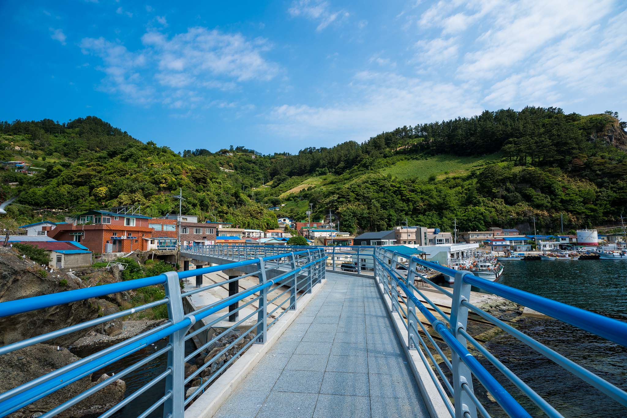 도동항 바로 옆으로 바다 위로 펼쳐진 길지 않은 산책로가 있다. 여기서 사진도 찍고 구경도 하면서 시간을 보냈다. 바다쪽에 해가 떠있어서 육지쪽은 쨍하게 멋진 색상을 담을 수 있었는데, 바다쪽은 역광이면서 구름이 낀 허연 하늘이라서 조금 사진찍는게 어렵긴했다.