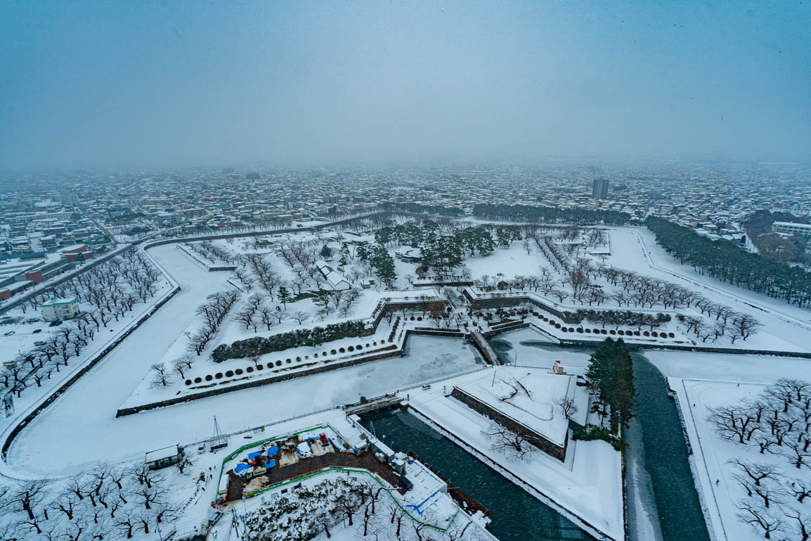 식사를 마치고 고료카쿠 타워로 가니 눈이 점점 많이 내리기 시작했다. 눈 때문에 흐려진 날씨로 인해 타워에 올라가도 멀리 시야가 나올지 않을 것 같아서 걱정이 되기는 했지만 우리는 고료카쿠 타워로 올라갔고, 강한 눈이 휘날리는 높은 전망대에서 고료카쿠와 함께 주변 도시를 구경할 수 있었다.